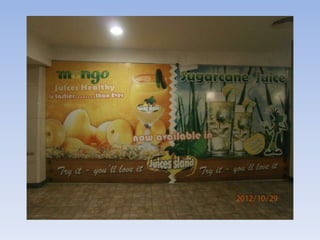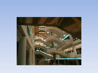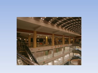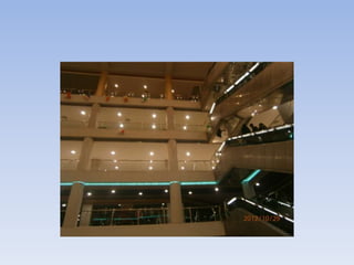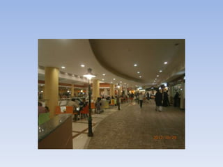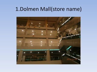 The document provides observations from visits to various shops and areas in Dolmen Mall in Karachi, Pakistan. It summarizes the design elements, atmosphere, and opportunities at each location. Key points include the outdoor style tiles and lighting used to create an outdoor feeling in the food court. Specific shops highlighted include Juices Island with a big lit lemon, Chairman Mao with an attractive ceiling design, and Zeritto Flowers with an exquisite sign board and flower arrangements. Opportunities for improvements at some locations are also suggested, such as better lighting and signage at Naheed Super Market to attract more customers.