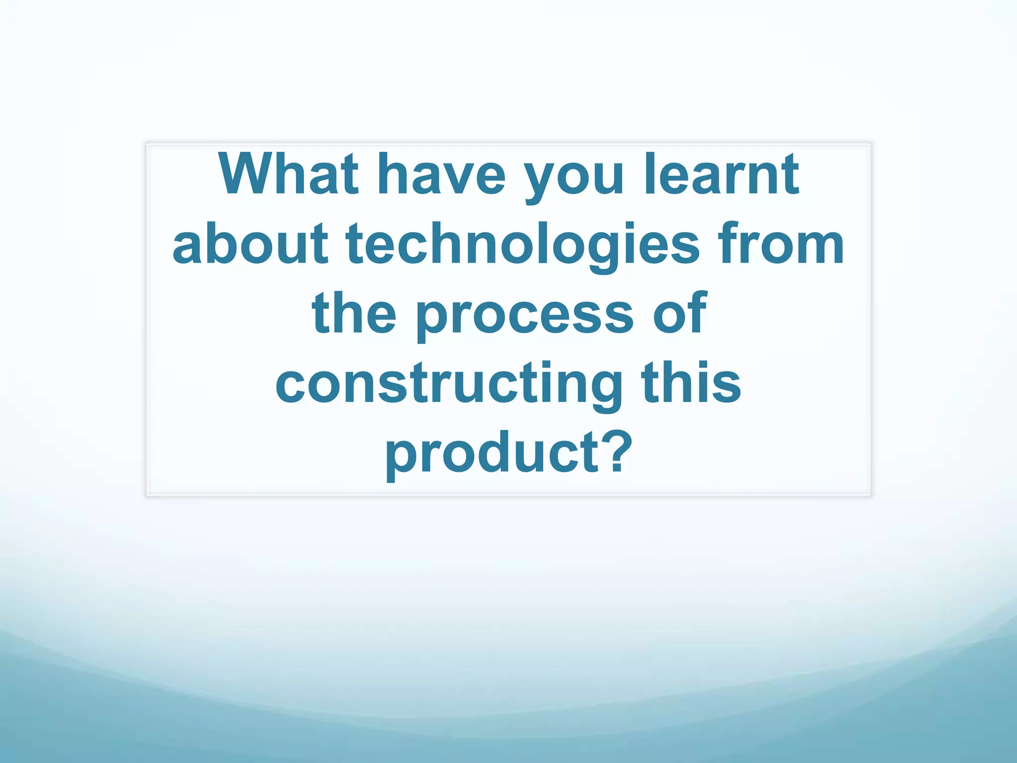 The document discusses various technologies the author learned about through constructing a product. The author learned how to create pages and insert various media types in Fronter. In Photoshop, the author learned how to overlap images, insert text, and adjust image properties. Voki allowed for a more personal presentation approach compared to text. Prezi was a new presentation tool that enabled more creativity than PowerPoint. YouTube was helpful for including videos. Using a DSLR camera different than their own helped expand photo skills.