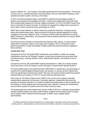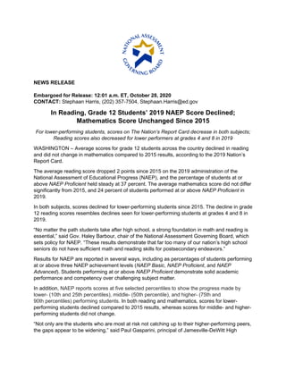 Grade 12 students' average reading score declined by 2 points since 2015 according to the 2019 National Assessment of Educational Progress, while their average mathematics score did not change. Scores also declined for lower-performing students in both subjects at grades 4, 8, and 12. The percentage of students performing at or above the proficient level held steady at 37% for reading and 24% for mathematics. The results indicate that gaps are widening between lower- and higher-performing students.