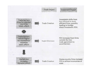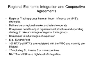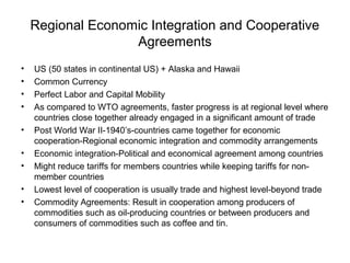 The document discusses regional economic integration and cooperative agreements, using NAFTA as a case study. It outlines the key provisions and effects of NAFTA, including increased trade and foreign direct investment between the US, Canada, and Mexico. While NAFTA increased trade flows, its impact on employment was mixed, as some jobs were gained while others were lost to Mexico's lower labor costs. Overall, NAFTA established a large integrated regional market in North America.