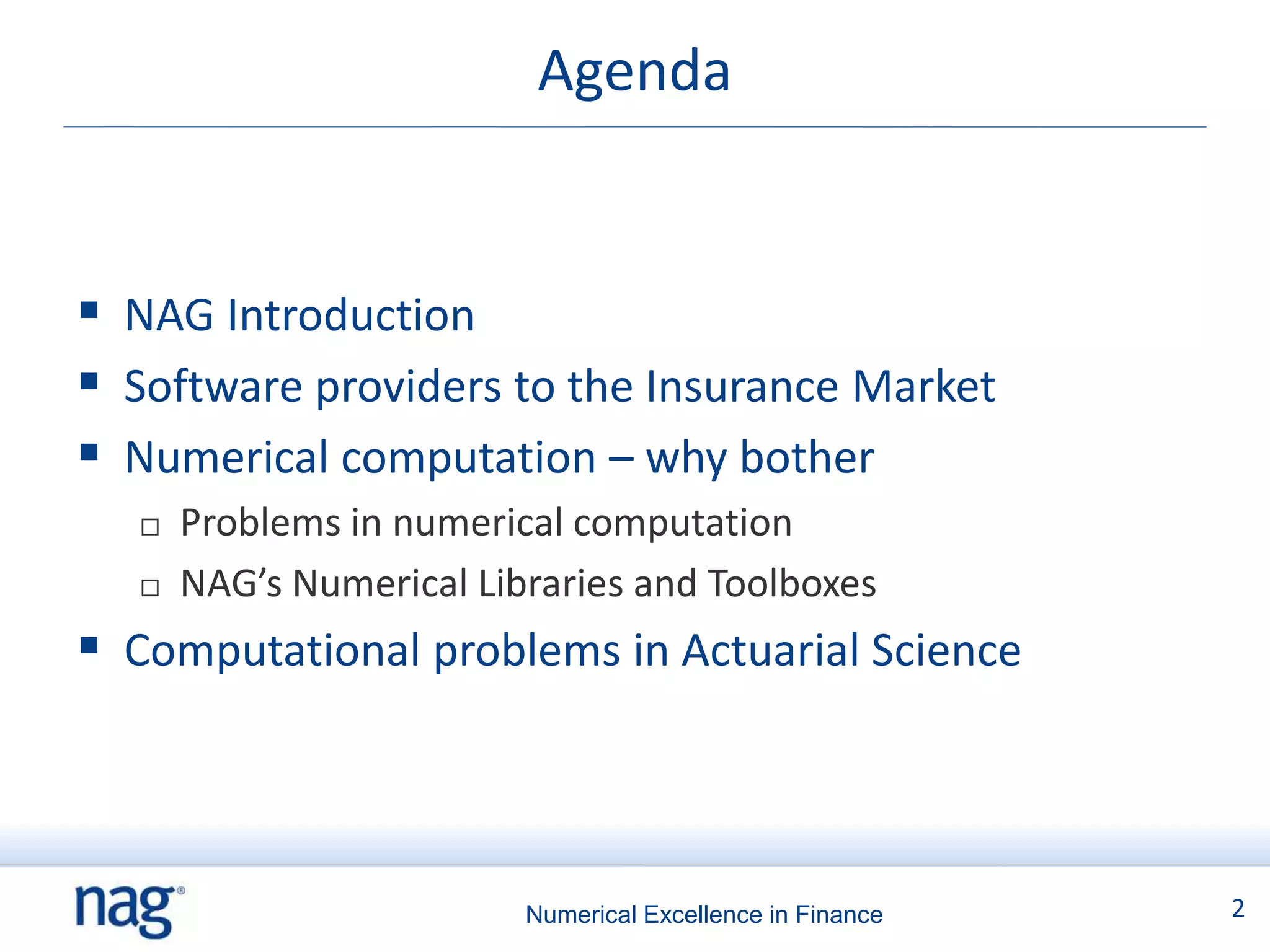 The document discusses numerical software and tools from NAG for the actuarial community. It provides an overview of NAG, including the types of numerical libraries and toolboxes it offers. It also discusses why numerical computation is important and challenging, and how software providers rely on libraries like NAG rather than writing all numerical code themselves. Actuarial problems that can benefit from NAG libraries are also highlighted.