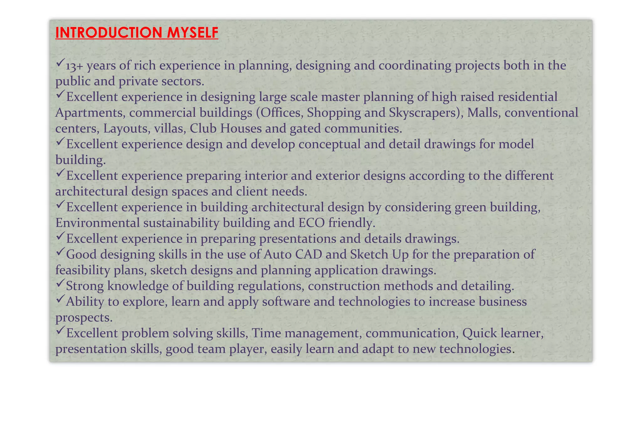 This document contains an introduction and portfolio from an architect with over 13 years of experience in planning, designing, and coordinating various projects in both the public and private sectors. It includes details on the architect's skills and experience with master planning, conceptual design, green building practices, software programs, and more. The portfolio section highlights examples of completed residential, commercial, and hotel projects ranging from apartments and villas to shopping malls. It also includes renderings of floor plans and interior design work for flats and banquet halls.