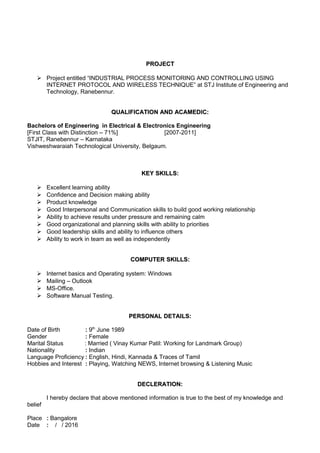 This document contains the resume of Nagaveena K Puttappanavar. She is seeking a challenging opportunity in manufacturing. Her previous role was as a Production Engineer at EMI Solutions Pvt Ltd from 2012 to 2015. In this role, she was responsible for planning production, establishing safety procedures, developing process improvements, and achieving production targets while handling 40 operators. Her qualifications include a Bachelor's degree in Electrical and Electronics Engineering. She has various technical skills and training including in AutoCAD, C programming, PLC, and SCADA systems.