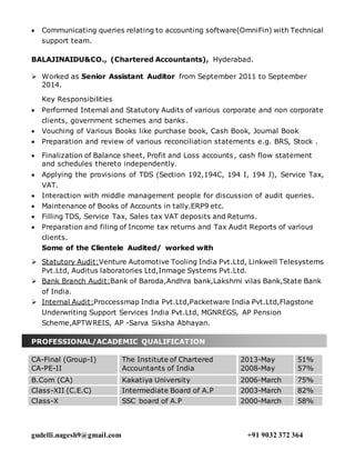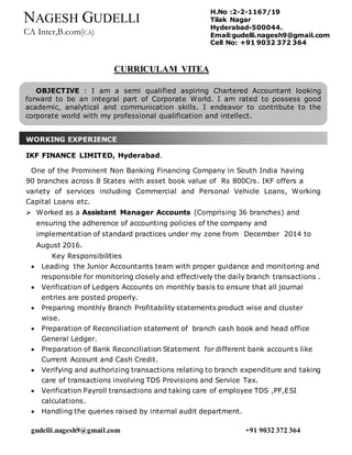 This document contains the resume of Nagesh Gudelli, a semi-qualified Chartered Accountant seeking a role in the corporate world. He has over 2 years of experience working as an Assistant Manager of Accounts at IKF Finance Limited, where he led a team of junior accountants and was responsible for branch accounting. Prior to this, he worked for over 3 years as a Senior Assistant Auditor at Balajinaidu & Co., where he conducted statutory, internal, and bank audits for various clients. Nagesh holds a CA Inter qualification and has completed his articleship training. He is proficient in accounting software like Tally and MS Office applications.