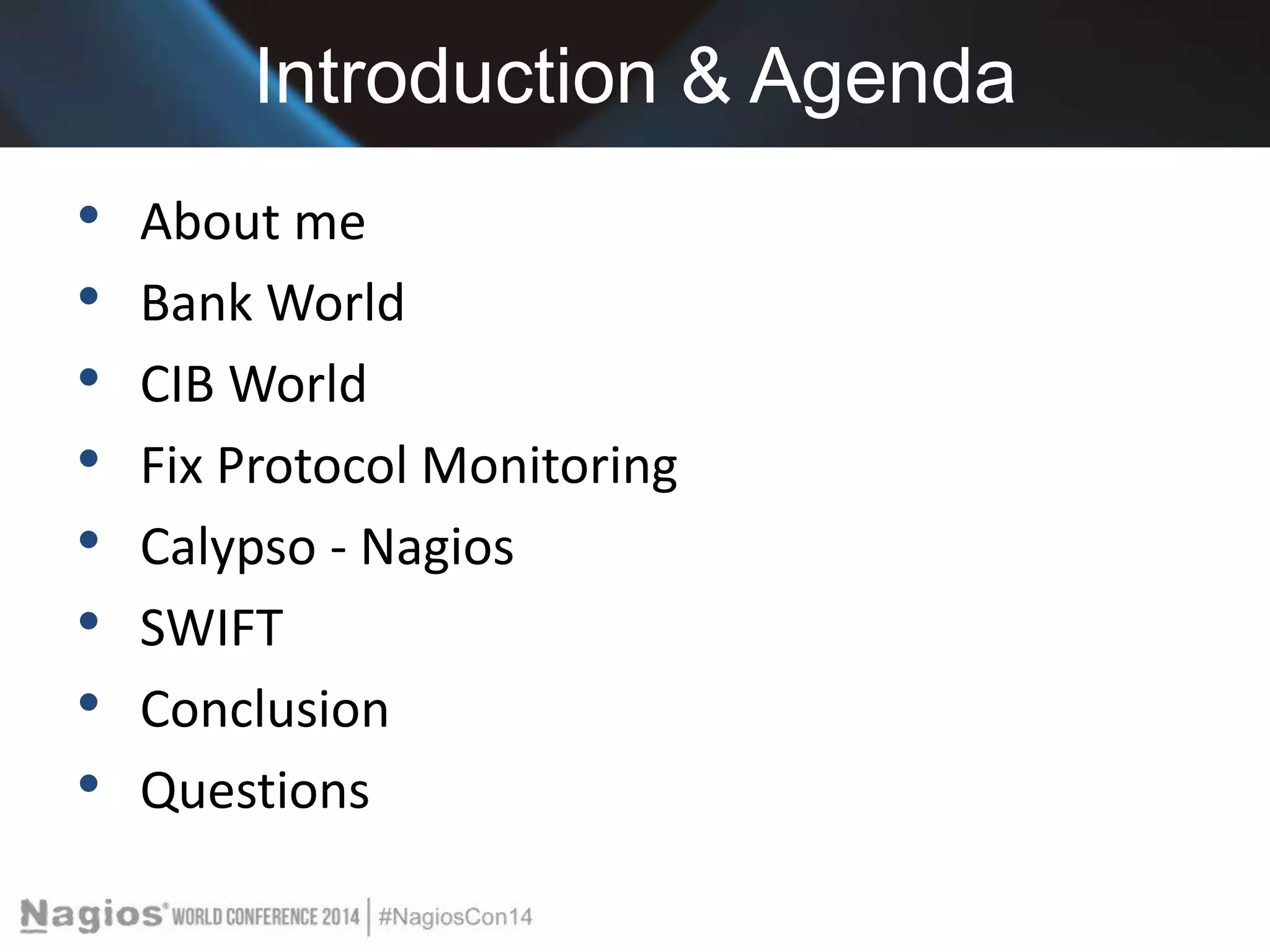 The document presents a discussion by Paloma Giraudo on the role of monitoring tools like Nagios in corporate finance, specifically in the banking and capital markets sectors. It covers various aspects including the use of Calypso and FIX protocol for trading and messaging services. The conclusion highlights the need for comprehensive monitoring solutions in investment banking, noting that existing tools may not offer a complete overview of the banking environment.