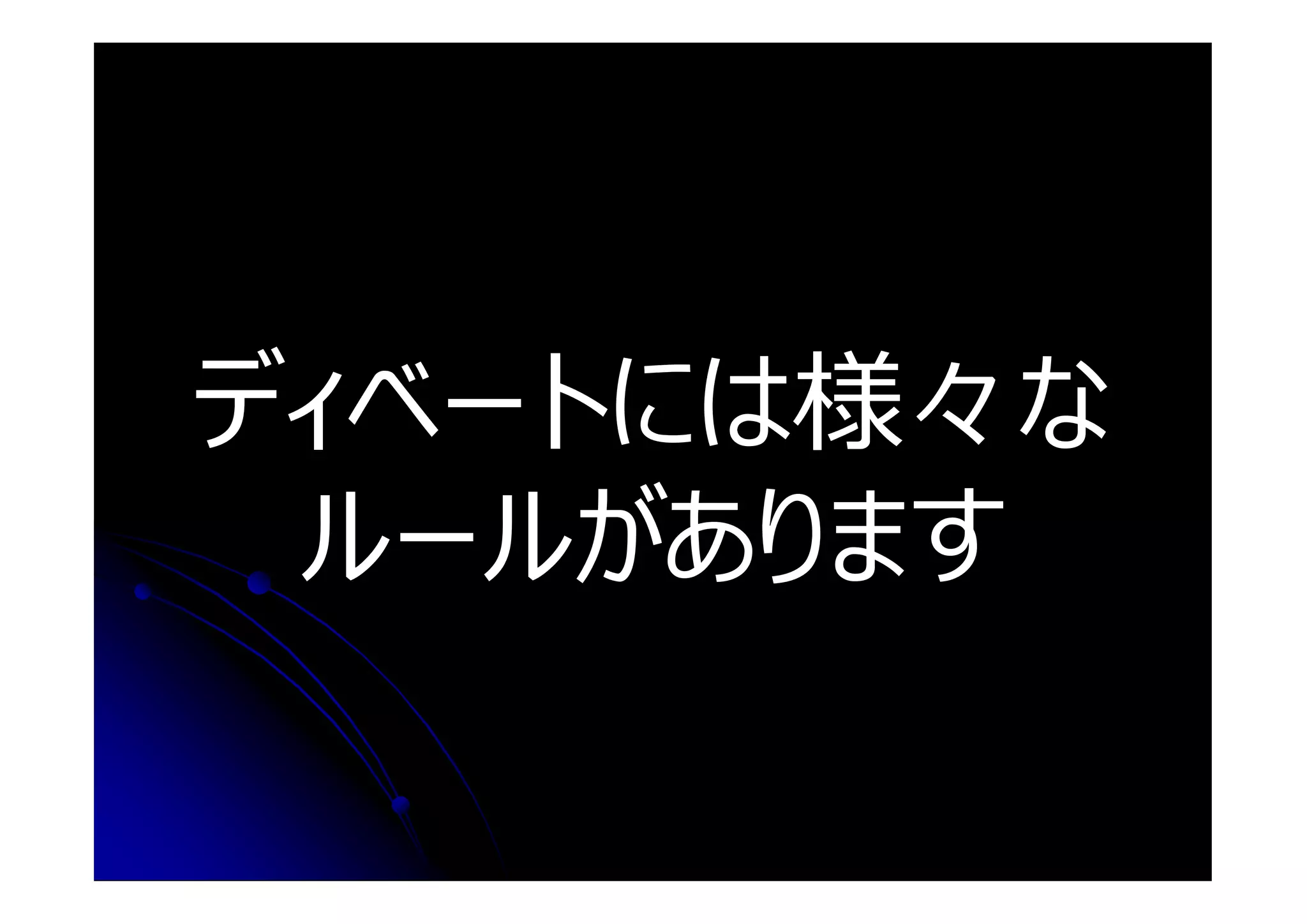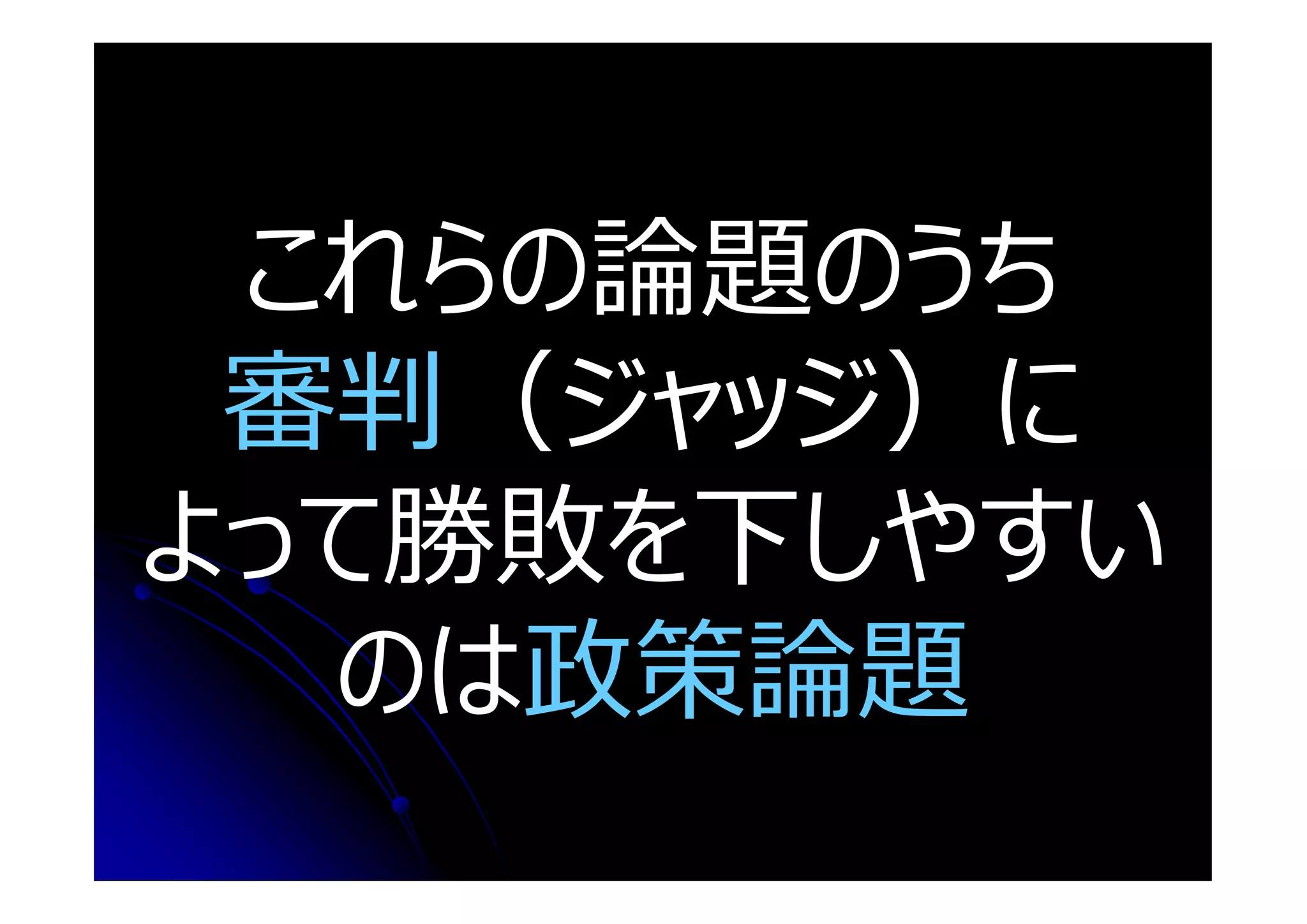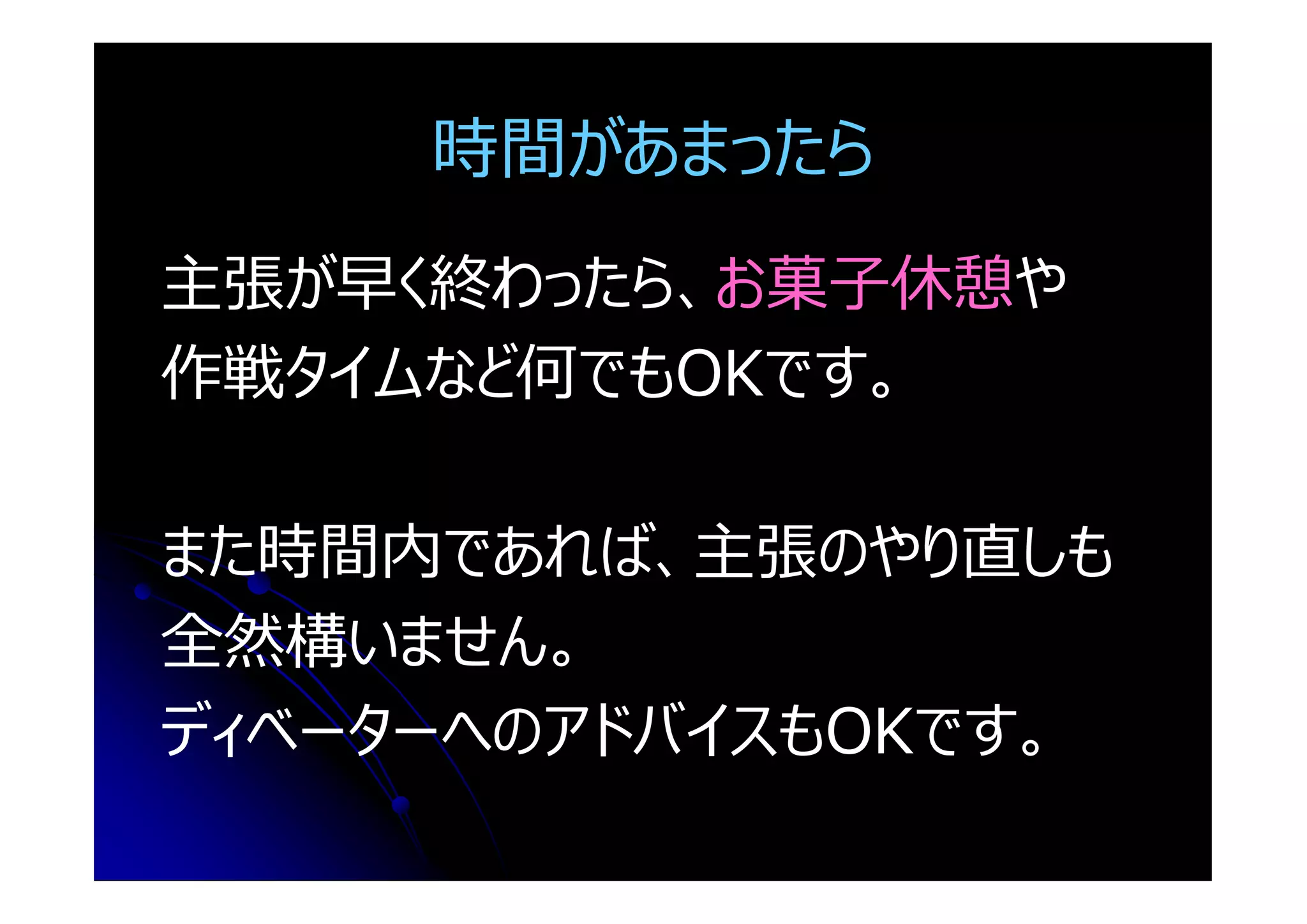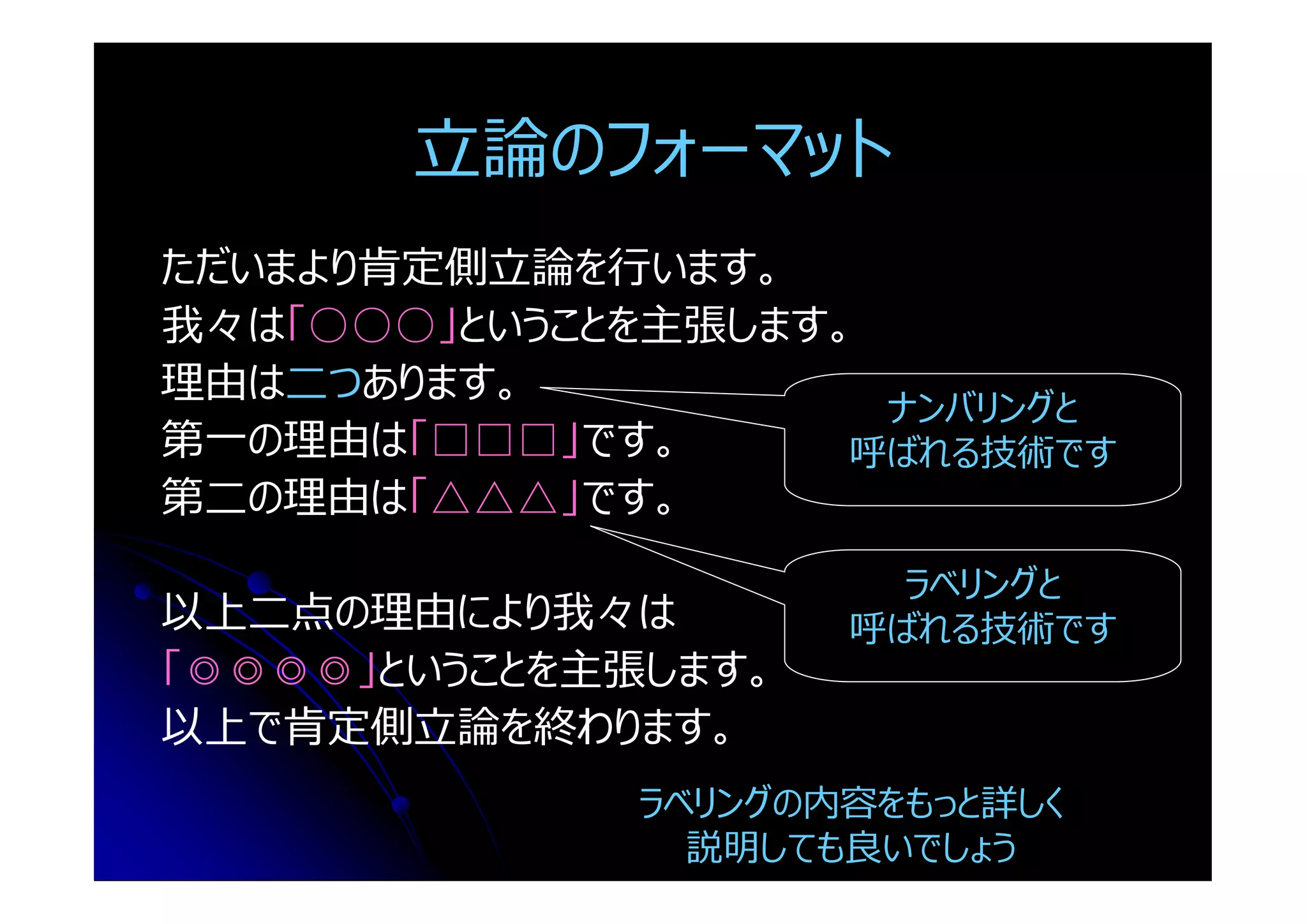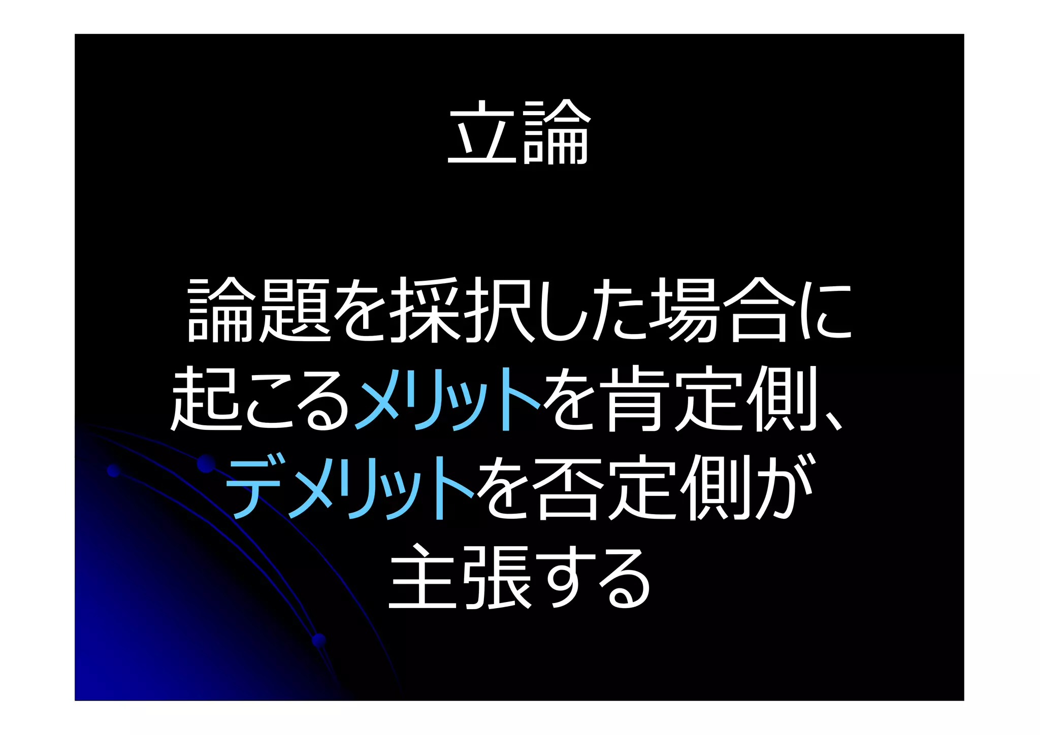 それぞれの議論の組み立て方のポイントを以下に示します。 肯定側立論 論題を正当化する主張を行うこと。 具体的には論題を採択した場合のメリットを提示する。 ナンバリング、ラベリング ラベリングなどを用いて主張を整理しておくこと。 ナンバリング ラベリング 否定側質疑 肯定側の主張の中で聞き取れなかった部分や再確認したいことを尋ねる。 相手の主張の根拠や前提を自分たちの反駁のために確認する。反論をするパートではありません。 反論をするパートではありません。 質疑は、相手の立論をつぶそうとする「反駁」につなげるための大事な役割です。 肯定側は応答を行いますが、Yes/Noで答えたり、立論を補強する回答をしましょう。 否定側立論 論題を否定するために論題を採択した場合のデメリットを提示する。 質疑は、こちらが相手の立論をつぶそうとする「反駁」につなげるための大事な役割です。 肯定側質疑 基本的に否定側質疑と同じです。 否定側第一反駁 肯定側の立論に対して、「○○は間違っています。それは△△だからです。その理由として~」 といった流れで反駁を行います。 反駁を行わないと相手の立論を認めてしまうことになりますので、立論に対して おかしいという理由を突きつけましょう。 肯定側第一反駁 肯定側第一反駁は、否定側立論と、肯定側質疑、そして否定側第一反駁に反駁します。 優先度としてはまず否定側立論には反駁しないと、相手の立論をすべて認めてしまう ことになるので、立論とその質疑への反駁を行うこと。 残りの時間がある限り、否定側第一反駁への反駁を行うこと。 ここで重要なのは自分たちの立論の核となる主張への反駁に対して反駁を行うこと。 否定側第二反駁 否定側第二反駁は、時間の半分を肯定側第一反駁の再反駁に使います。 残りの半分を価値の比較に使い、「自分達の意見がいかに相手の意見よりまさっているのか」 の説明をします。自分たちの主張を強調し、相手の主張が小さいものだと訴えましょう。 肯定側第二反駁 肯定側第二反駁は基本的には否定側第二反駁と同じですが、反駁の対象が否定側第二反駁です。 肯定側第二反駁は、否定側第二反駁に対して再反駁をくわえた後、価値の比較をします。 ポイントとして否定側が再反駁してこなかった主張などがあればそこは「認められたものとします」というように 強調してもいいでしょう。