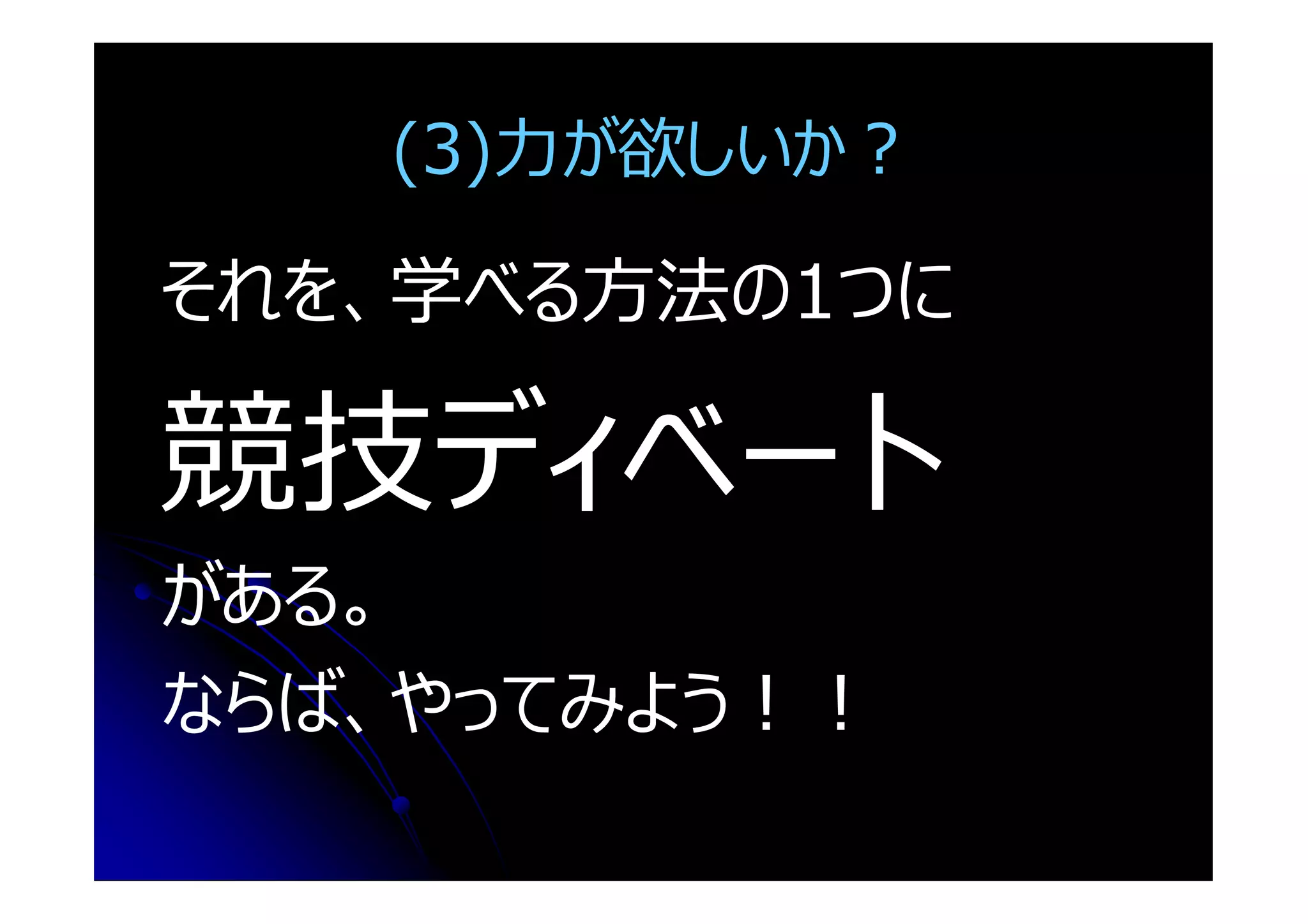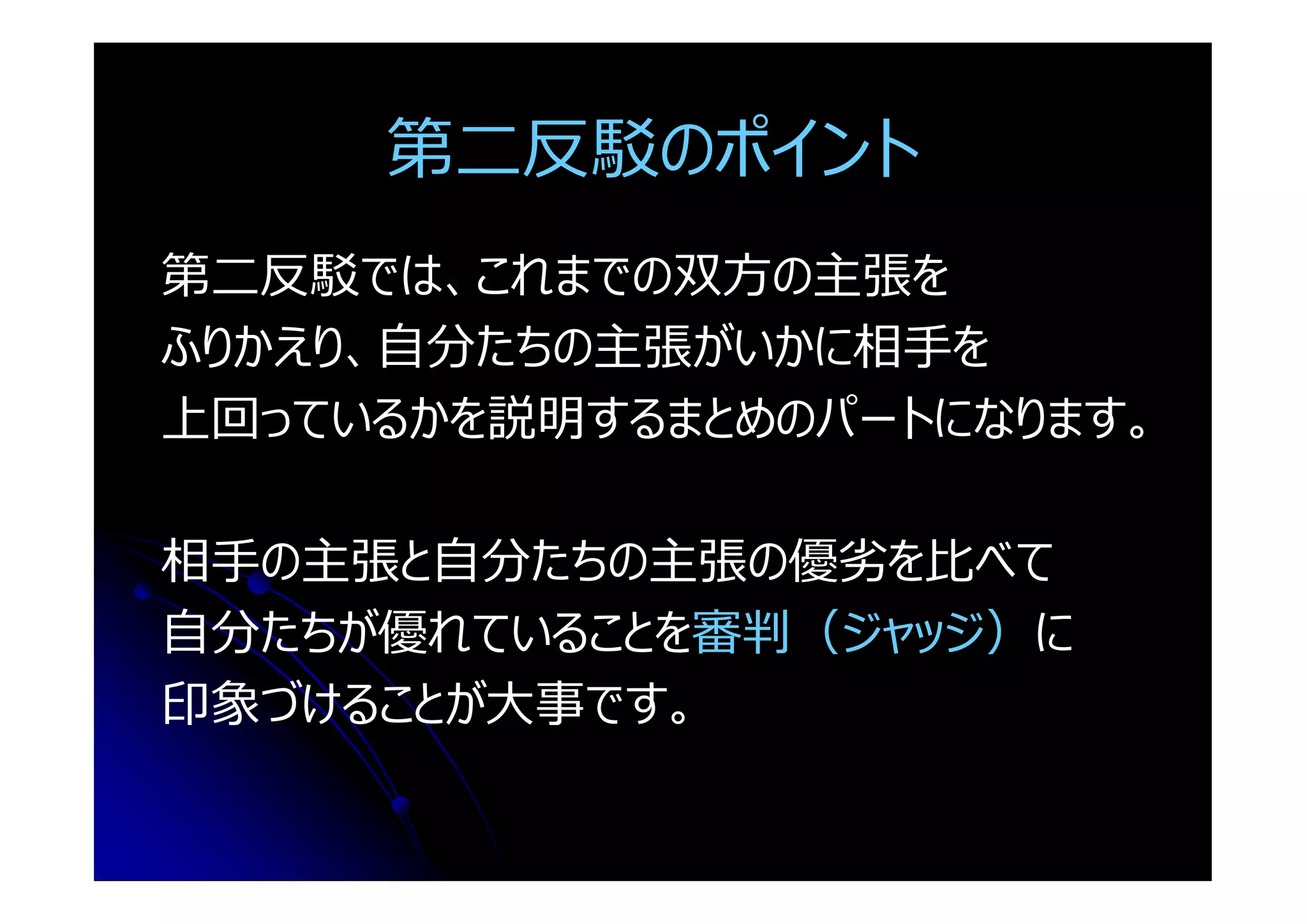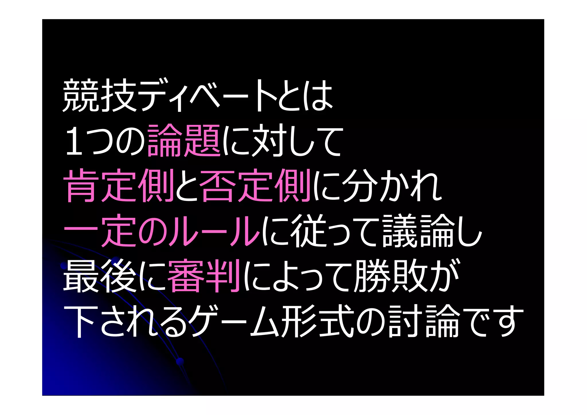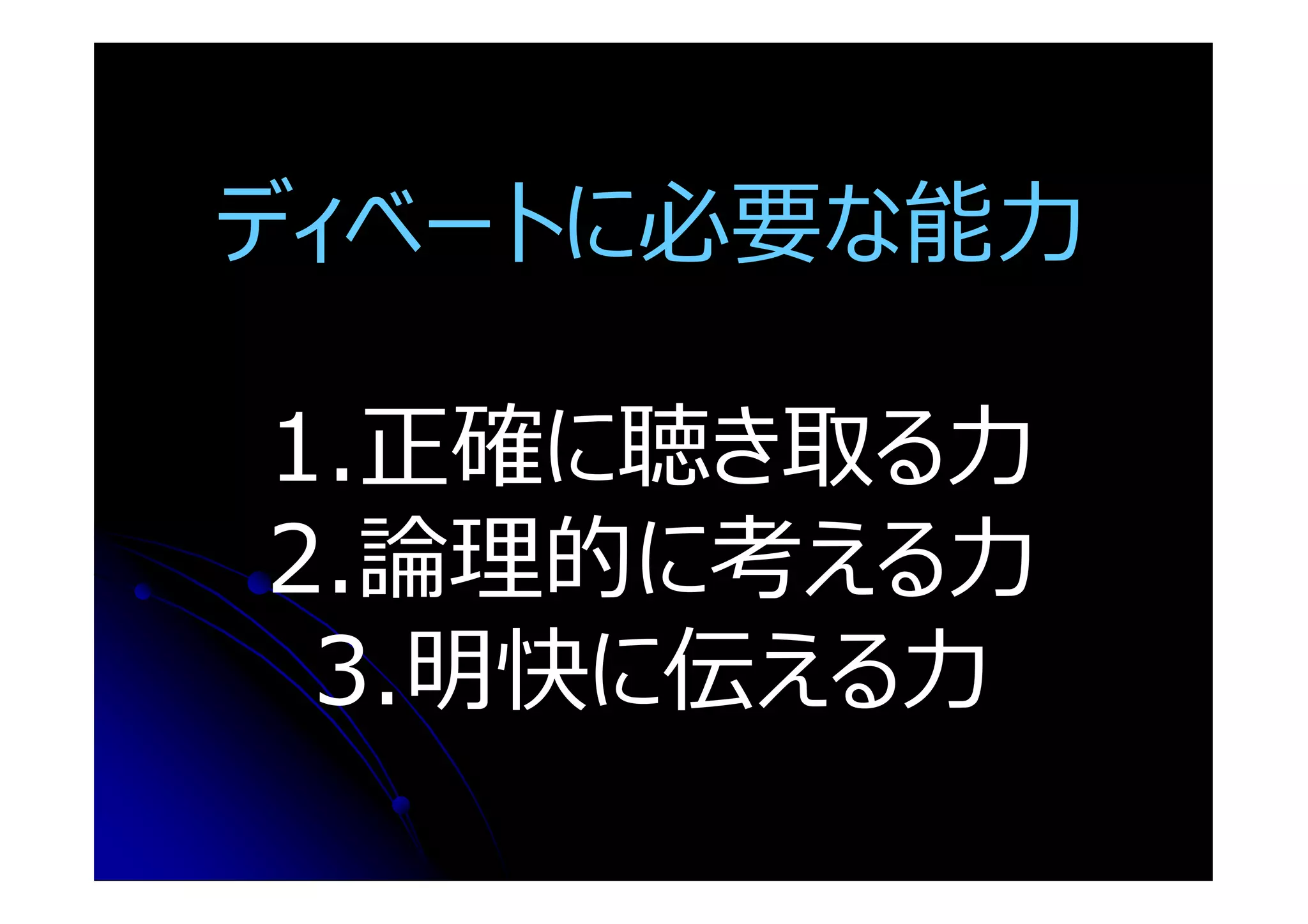 それぞれの議論の組み立て方のポイントを以下に示します。 肯定側立論 論題を正当化する主張を行うこと。 具体的には論題を採択した場合のメリットを提示する。 ナンバリング、ラベリング ラベリングなどを用いて主張を整理しておくこと。 ナンバリング ラベリング 否定側質疑 肯定側の主張の中で聞き取れなかった部分や再確認したいことを尋ねる。 相手の主張の根拠や前提を自分たちの反駁のために確認する。反論をするパートではありません。 反論をするパートではありません。 質疑は、相手の立論をつぶそうとする「反駁」につなげるための大事な役割です。 肯定側は応答を行いますが、Yes/Noで答えたり、立論を補強する回答をしましょう。 否定側立論 論題を否定するために論題を採択した場合のデメリットを提示する。 質疑は、こちらが相手の立論をつぶそうとする「反駁」につなげるための大事な役割です。 肯定側質疑 基本的に否定側質疑と同じです。 否定側第一反駁 肯定側の立論に対して、「○○は間違っています。それは△△だからです。その理由として~」 といった流れで反駁を行います。 反駁を行わないと相手の立論を認めてしまうことになりますので、立論に対して おかしいという理由を突きつけましょう。 肯定側第一反駁 肯定側第一反駁は、否定側立論と、肯定側質疑、そして否定側第一反駁に反駁します。 優先度としてはまず否定側立論には反駁しないと、相手の立論をすべて認めてしまう ことになるので、立論とその質疑への反駁を行うこと。 残りの時間がある限り、否定側第一反駁への反駁を行うこと。 ここで重要なのは自分たちの立論の核となる主張への反駁に対して反駁を行うこと。 否定側第二反駁 否定側第二反駁は、時間の半分を肯定側第一反駁の再反駁に使います。 残りの半分を価値の比較に使い、「自分達の意見がいかに相手の意見よりまさっているのか」 の説明をします。自分たちの主張を強調し、相手の主張が小さいものだと訴えましょう。 肯定側第二反駁 肯定側第二反駁は基本的には否定側第二反駁と同じですが、反駁の対象が否定側第二反駁です。 肯定側第二反駁は、否定側第二反駁に対して再反駁をくわえた後、価値の比較をします。 ポイントとして否定側が再反駁してこなかった主張などがあればそこは「認められたものとします」というように 強調してもいいでしょう。
