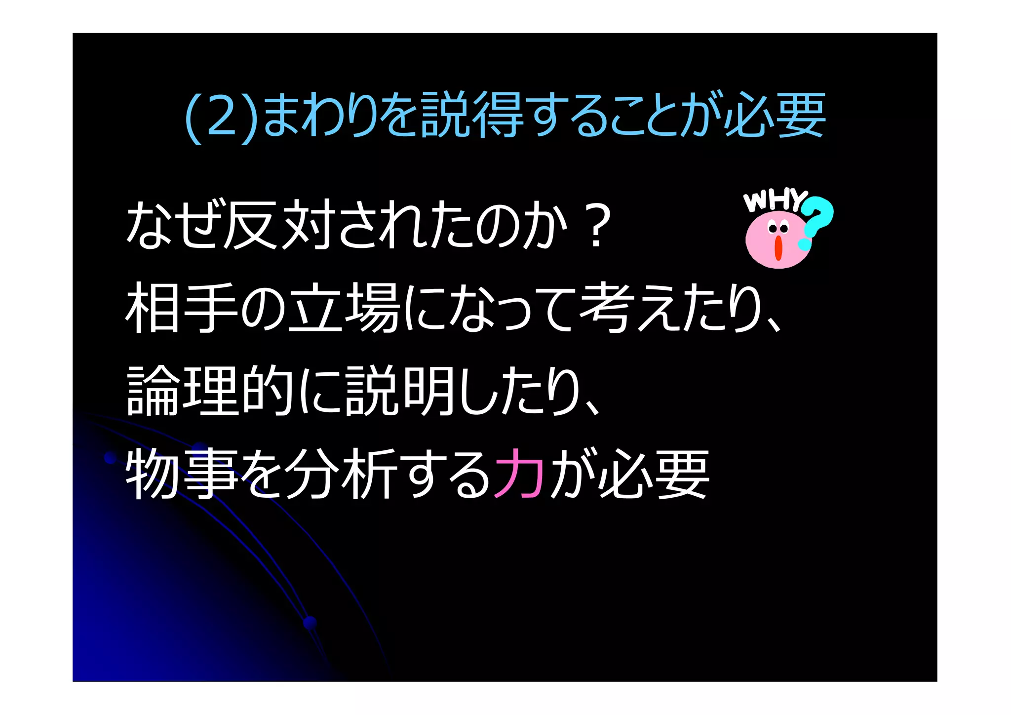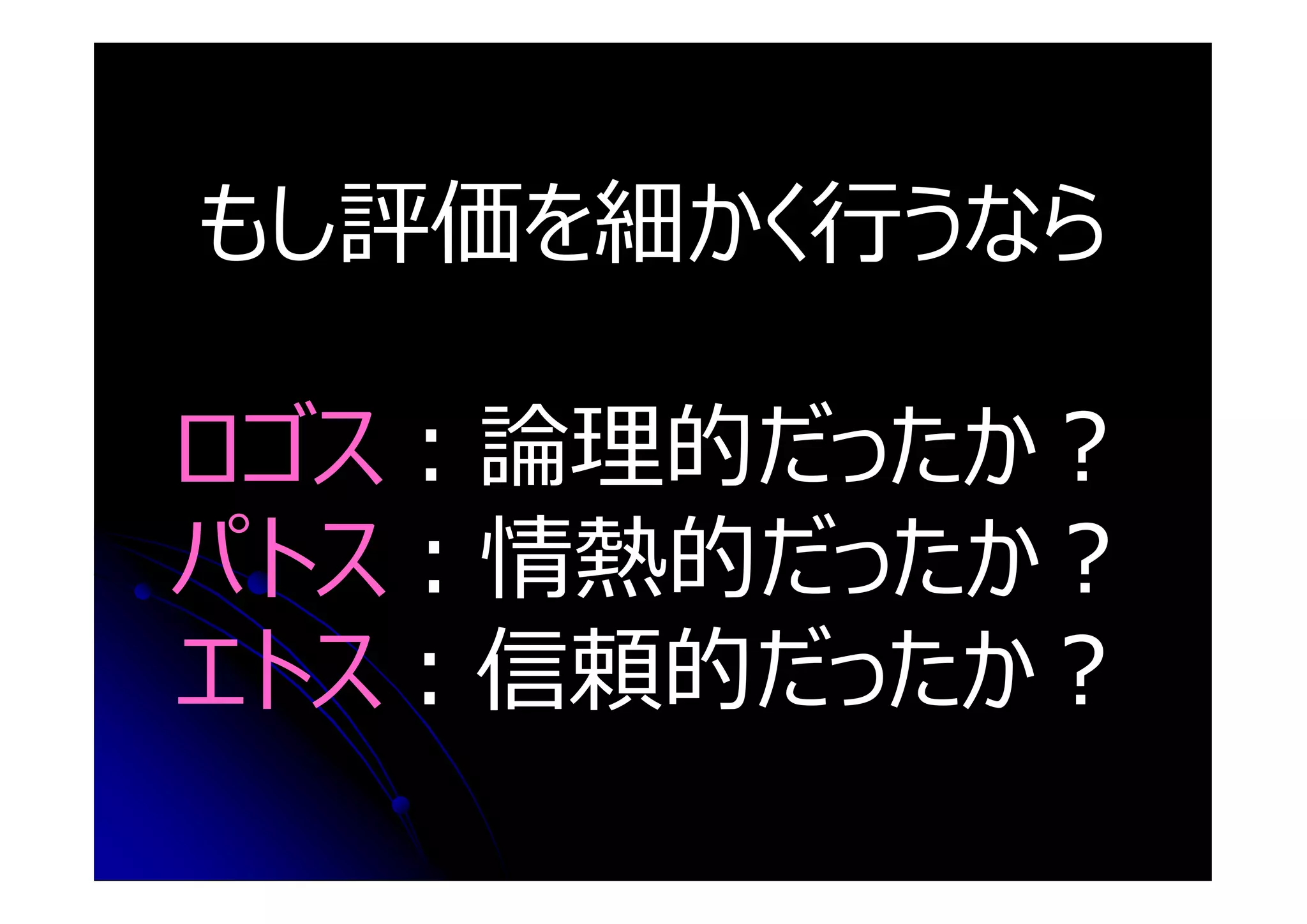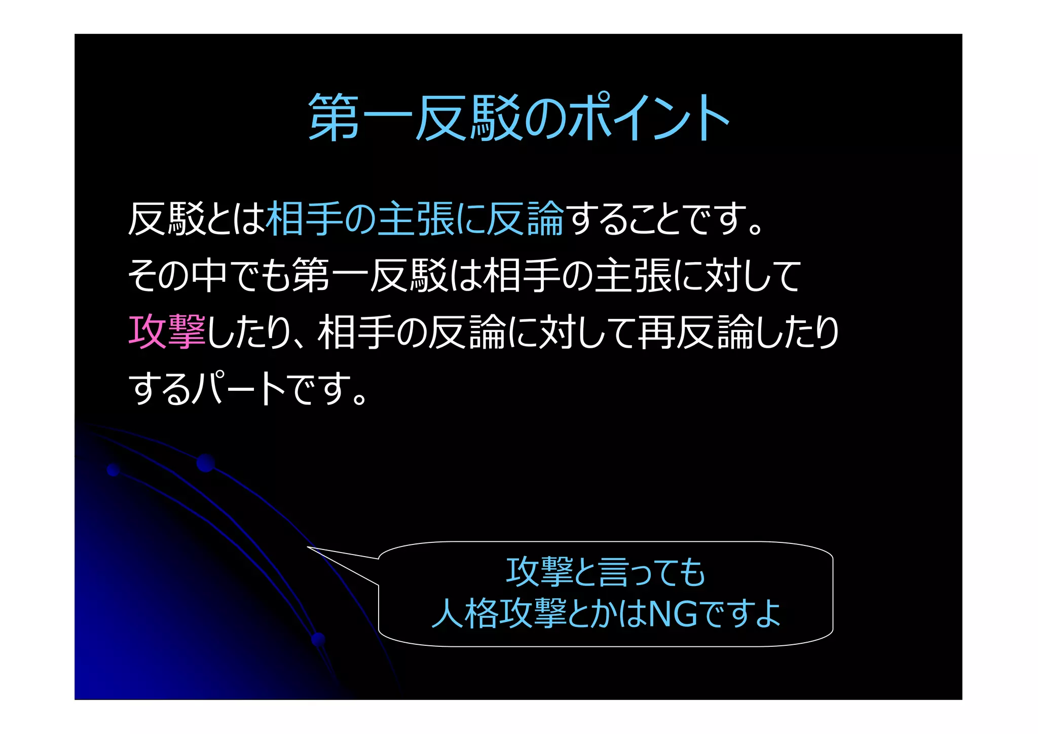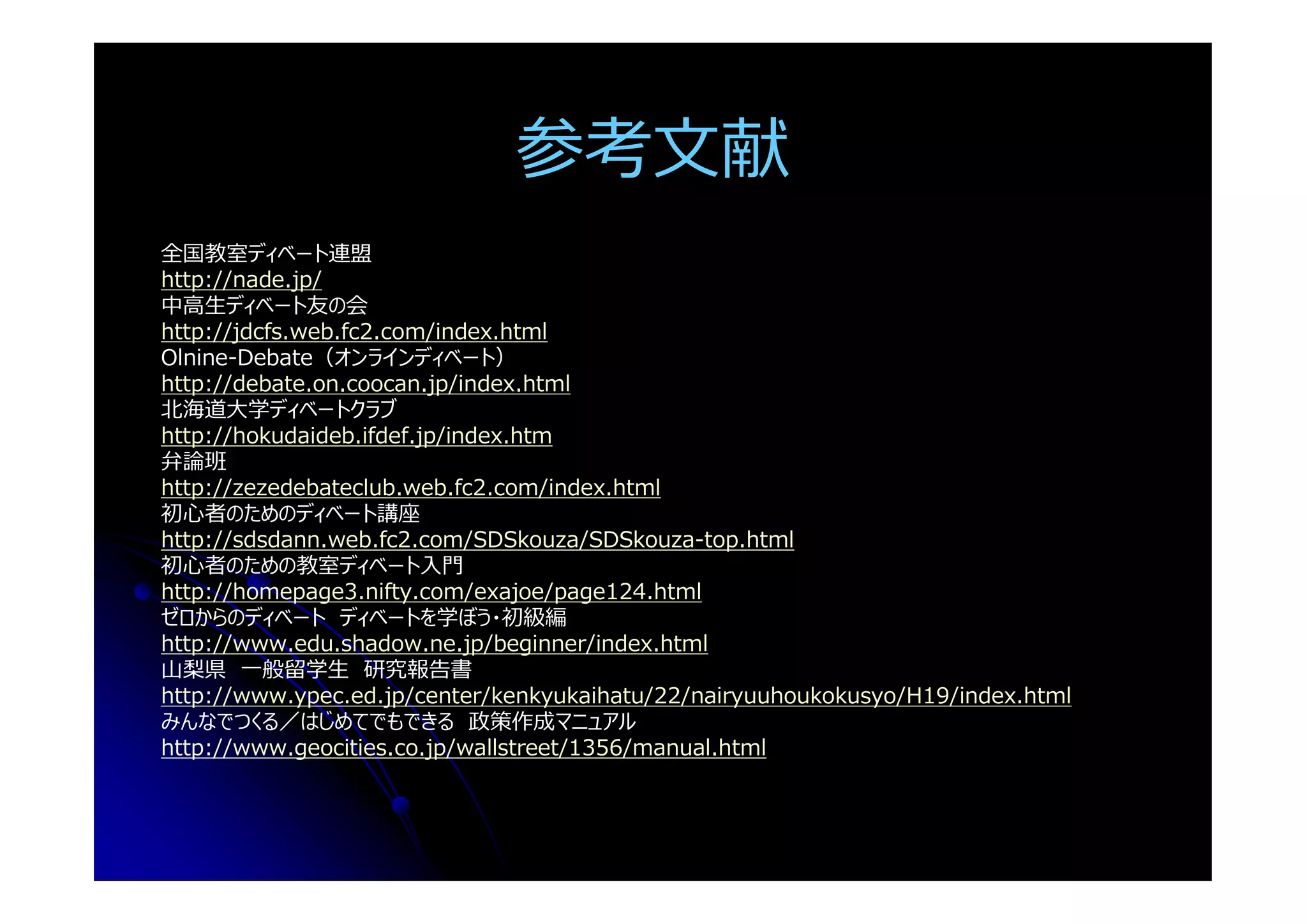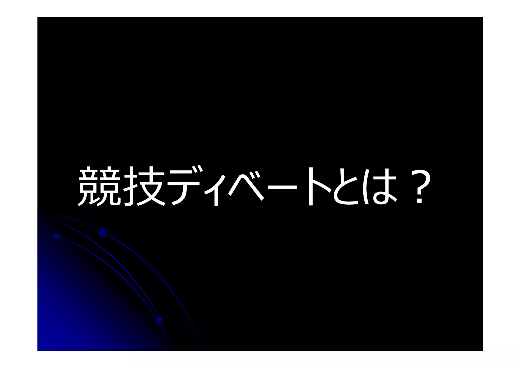 それぞれの議論の組み立て方のポイントを以下に示します。 肯定側立論 論題を正当化する主張を行うこと。 具体的には論題を採択した場合のメリットを提示する。 ナンバリング、ラベリング ラベリングなどを用いて主張を整理しておくこと。 ナンバリング ラベリング 否定側質疑 肯定側の主張の中で聞き取れなかった部分や再確認したいことを尋ねる。 相手の主張の根拠や前提を自分たちの反駁のために確認する。反論をするパートではありません。 反論をするパートではありません。 質疑は、相手の立論をつぶそうとする「反駁」につなげるための大事な役割です。 肯定側は応答を行いますが、Yes/Noで答えたり、立論を補強する回答をしましょう。 否定側立論 論題を否定するために論題を採択した場合のデメリットを提示する。 質疑は、こちらが相手の立論をつぶそうとする「反駁」につなげるための大事な役割です。 肯定側質疑 基本的に否定側質疑と同じです。 否定側第一反駁 肯定側の立論に対して、「○○は間違っています。それは△△だからです。その理由として~」 といった流れで反駁を行います。 反駁を行わないと相手の立論を認めてしまうことになりますので、立論に対して おかしいという理由を突きつけましょう。 肯定側第一反駁 肯定側第一反駁は、否定側立論と、肯定側質疑、そして否定側第一反駁に反駁します。 優先度としてはまず否定側立論には反駁しないと、相手の立論をすべて認めてしまう ことになるので、立論とその質疑への反駁を行うこと。 残りの時間がある限り、否定側第一反駁への反駁を行うこと。 ここで重要なのは自分たちの立論の核となる主張への反駁に対して反駁を行うこと。 否定側第二反駁 否定側第二反駁は、時間の半分を肯定側第一反駁の再反駁に使います。 残りの半分を価値の比較に使い、「自分達の意見がいかに相手の意見よりまさっているのか」 の説明をします。自分たちの主張を強調し、相手の主張が小さいものだと訴えましょう。 肯定側第二反駁 肯定側第二反駁は基本的には否定側第二反駁と同じですが、反駁の対象が否定側第二反駁です。 肯定側第二反駁は、否定側第二反駁に対して再反駁をくわえた後、価値の比較をします。 ポイントとして否定側が再反駁してこなかった主張などがあればそこは「認められたものとします」というように 強調してもいいでしょう。