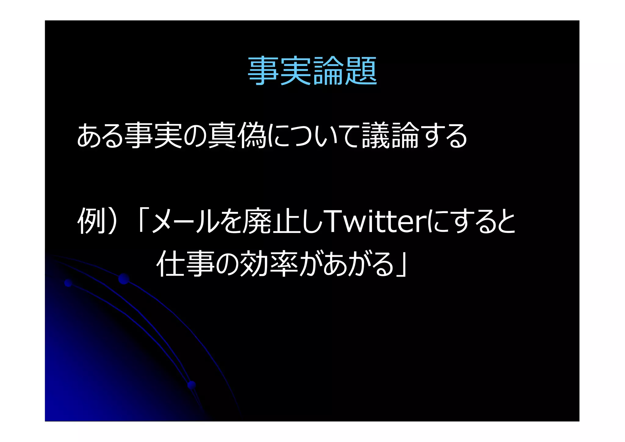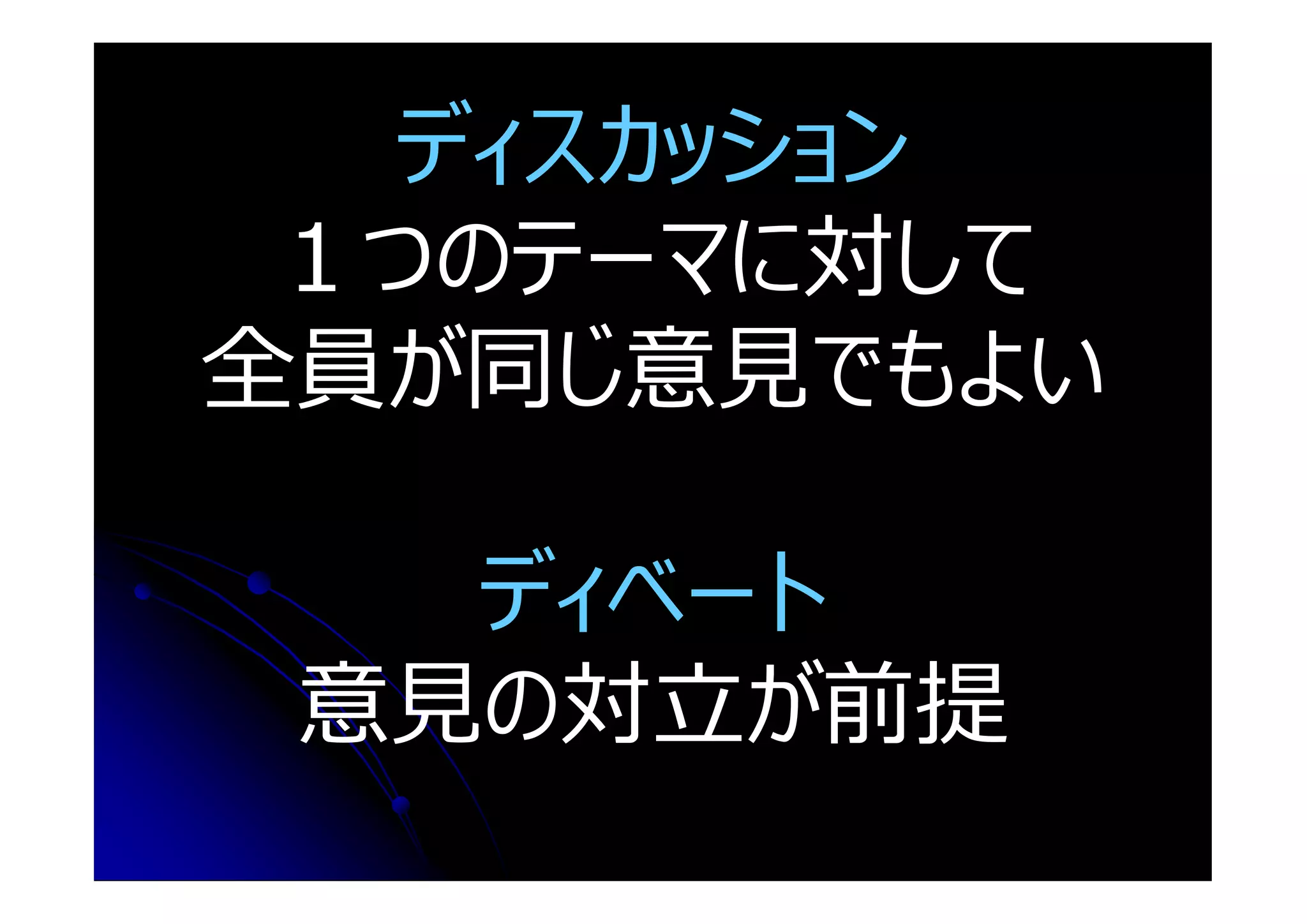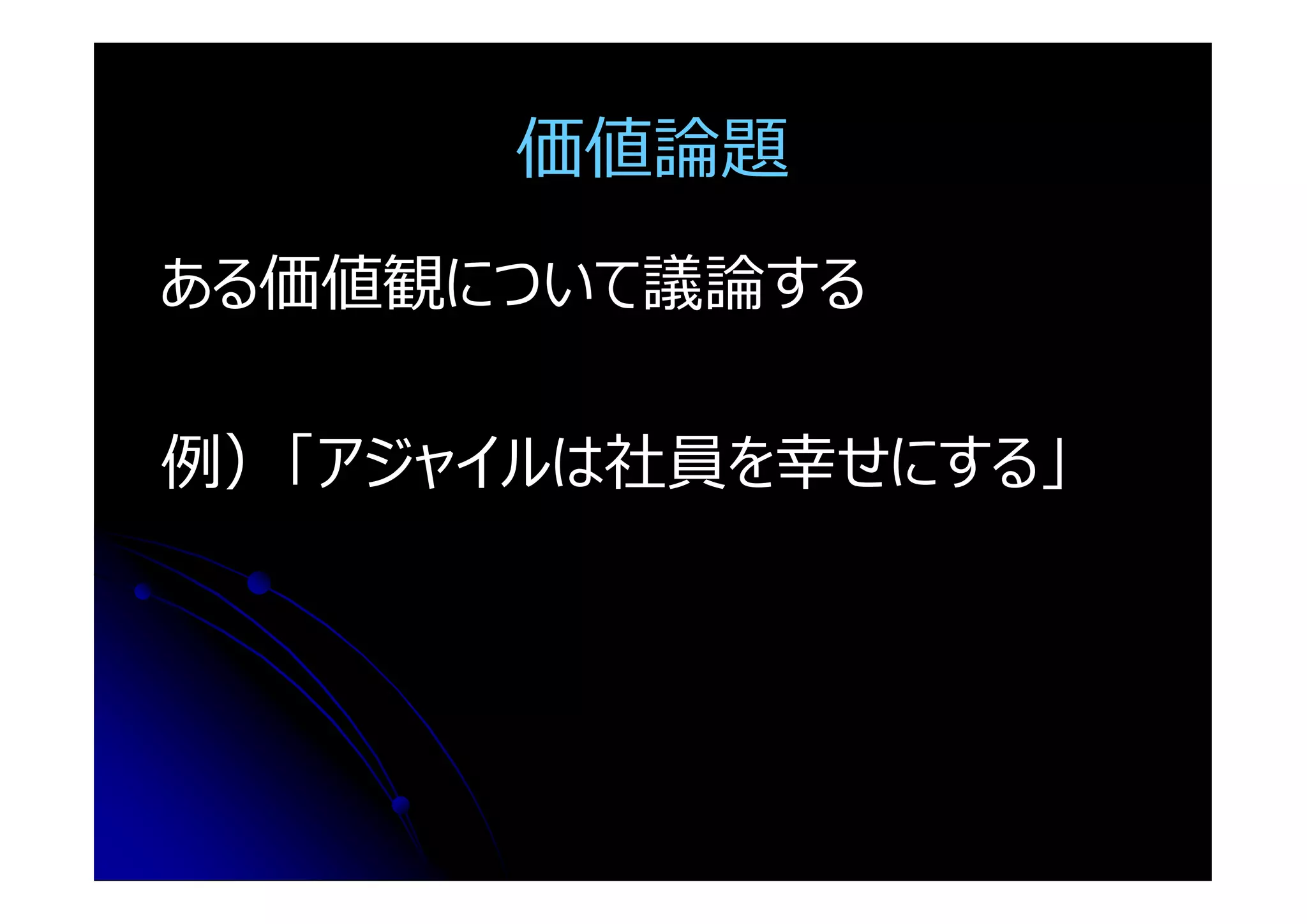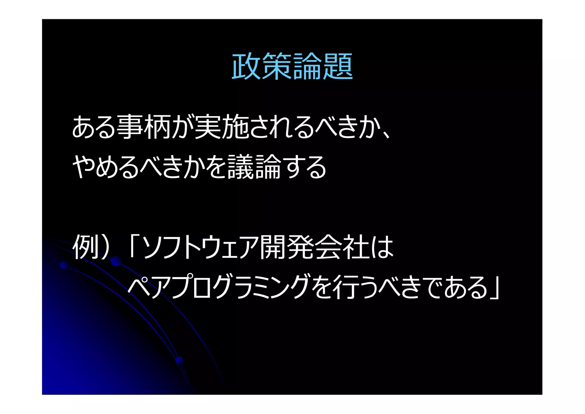 ディベートでは「議論する余地があること 議論する余地があること」をテーマにすることが大事です。 議論する余地があること さらに今回は 証拠資料(エビデンス)を必要としないもの。(スマホで調べる等はOKです) 論題には3つほどあります。 政策論題:やるべきか、やめるべきか?の是非を問う論題です。 例)ソフトウェア会社はペアプログラミングを行うべきである。 価値論題:価値の有無、あるいは優劣を問う論題です。 例)アジャイルは社員を幸せにする。 事実論題:過去、現在、未来に起きた/起きることの有無を問う論題です。 例)メールを廃止しTwitterにすると仕事の効率があがる。 できるだけ議論のしやすさから政策論題を選ぶこと。 テーブルの全員が議論できると思えるものを選びましょう。 政策論題のテーマ例 ・日本政府は,タバコの販売及び消費を禁止すべきである ・日本はペットの売買を禁止すべきである ・市は救急車を有料化すべきである ・エスカレーターでは左に並ぶべきである ・社員同士の年賀状は禁止すべきである ・企業は採用を通年制にするべきである ・企業は時差通勤を導入するべきである ・企業はFacebookページを作成すべきである ・社員旅行は行うべきである ・Excel方眼紙はやめるべきである ・システム開発ではTDDを行うべきである ・人月単価をやめるべきである ・個人評価からチーム評価に変えるべきである ・ソフトウェア会社はペアプログラミングを行うべきである ・ソフトウェア会社はScrumを導入するべきである ・ソフトウェア技術者はもっと給与格差をつけるべきである ・ソフトウェア技術者は勉強会には参加するべきである 価値論題のテーマ例 ・チームのコミュニケーション不足・情報共有不足を 解消するには、ペアプロ、朝会のどちらがふさわしいか? ・アジャイルは社員を幸せにする。 事実論題のテーマ例 ・メールを廃止しTwitterにすると仕事の効率があがる。