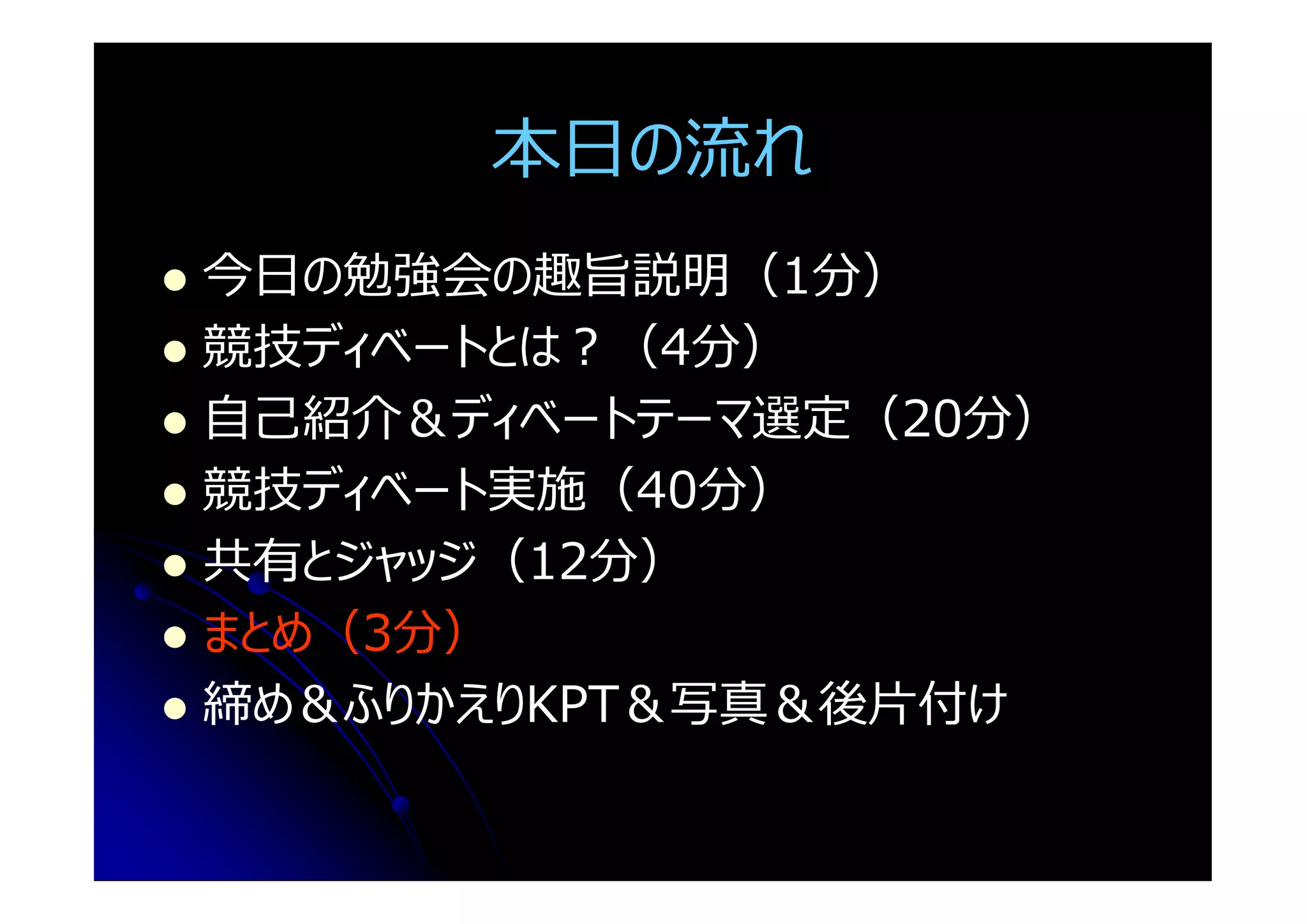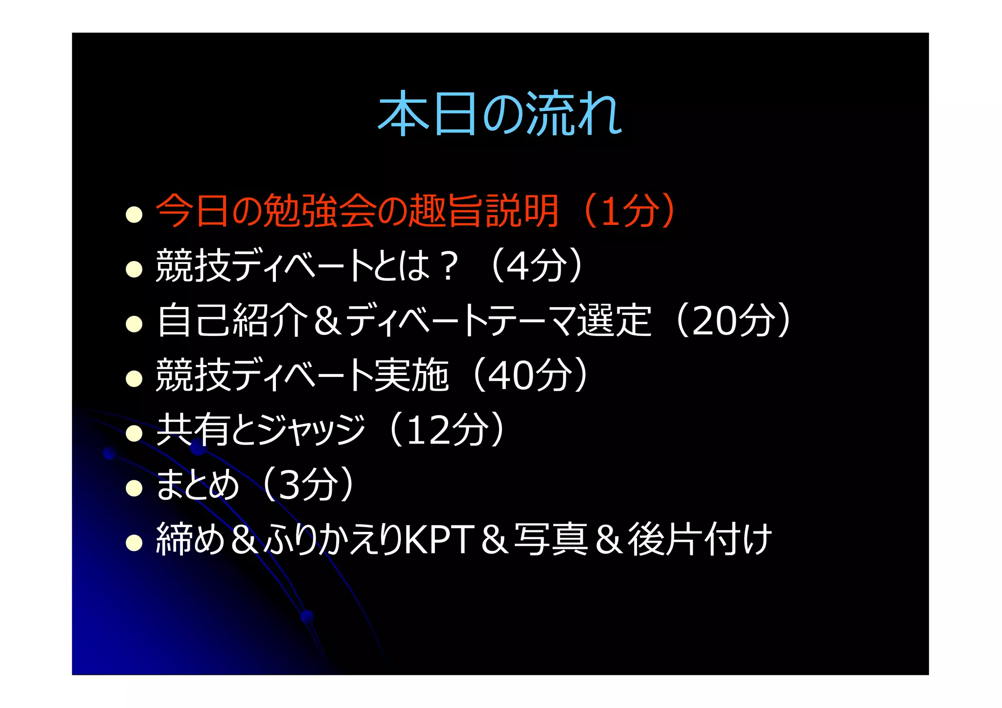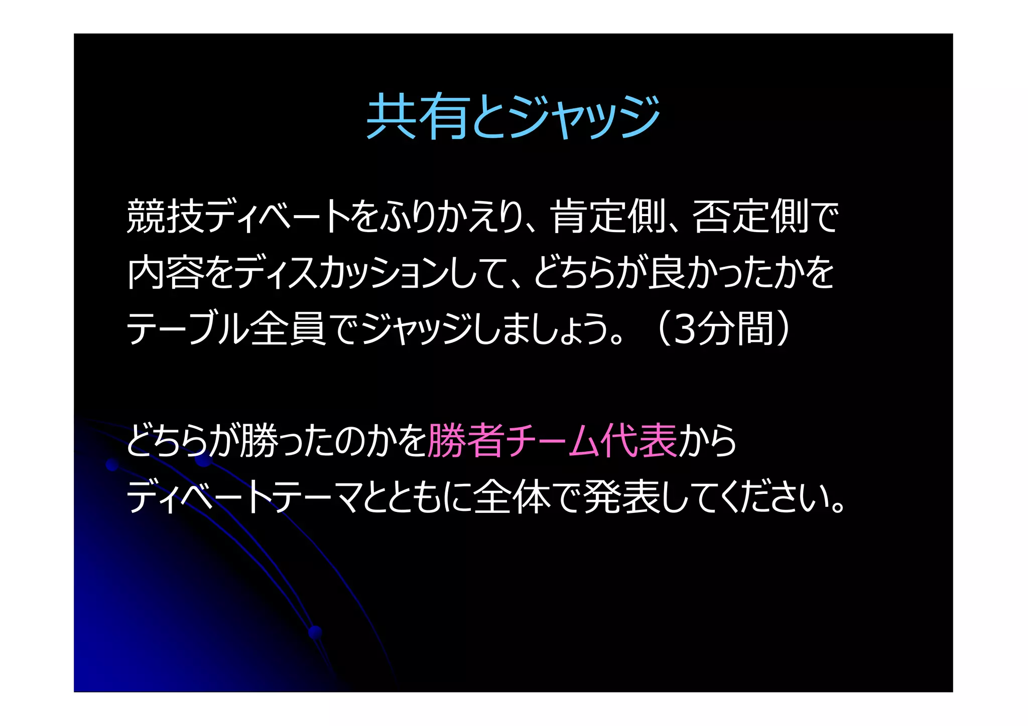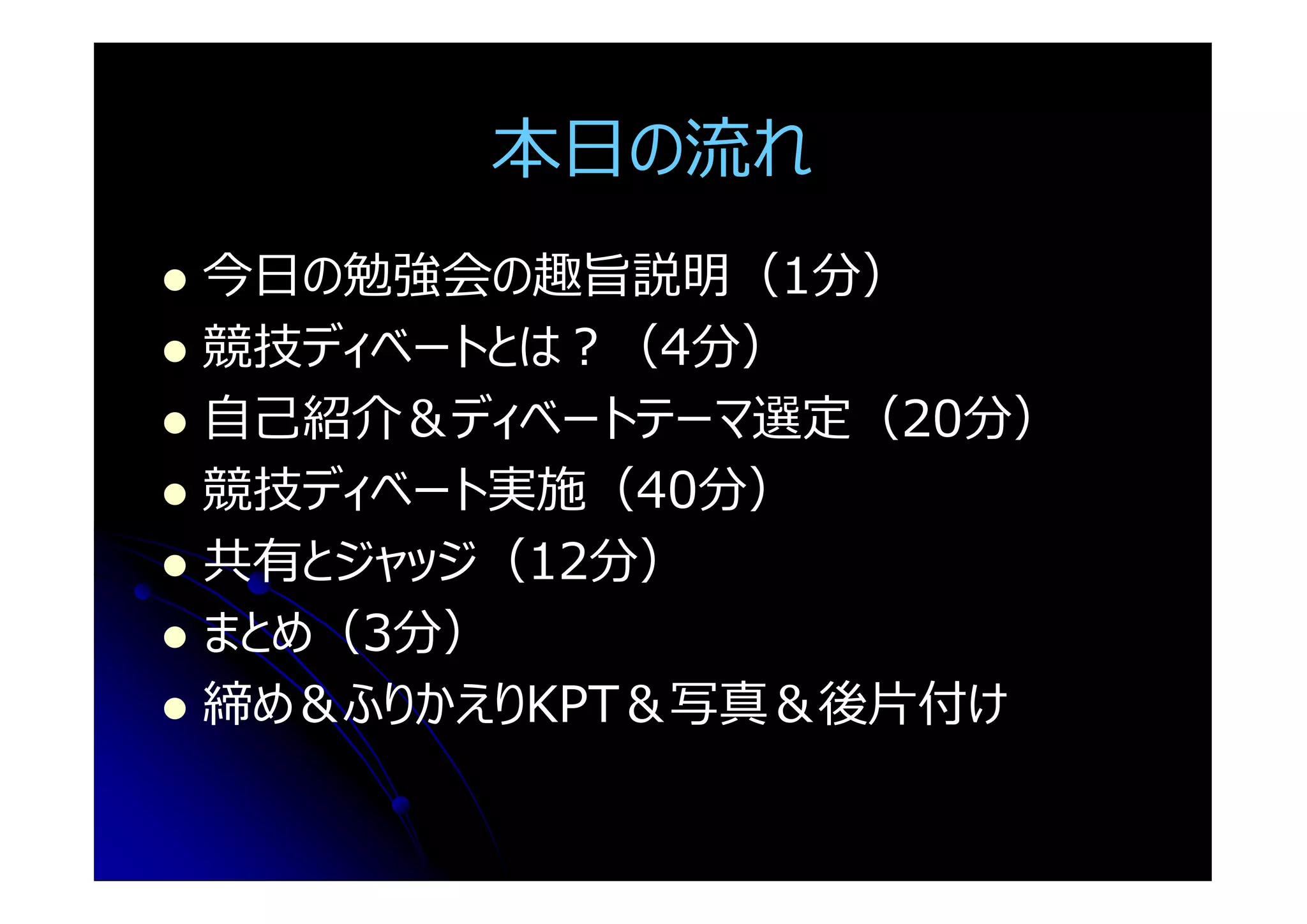 ディベートでは「議論する余地があること 議論する余地があること」をテーマにすることが大事です。 議論する余地があること さらに今回は 証拠資料(エビデンス)を必要としないもの。(スマホで調べる等はOKです) 論題には3つほどあります。 政策論題:やるべきか、やめるべきか?の是非を問う論題です。 例)ソフトウェア会社はペアプログラミングを行うべきである。 価値論題:価値の有無、あるいは優劣を問う論題です。 例)アジャイルは社員を幸せにする。 事実論題:過去、現在、未来に起きた/起きることの有無を問う論題です。 例)メールを廃止しTwitterにすると仕事の効率があがる。 できるだけ議論のしやすさから政策論題を選ぶこと。 テーブルの全員が議論できると思えるものを選びましょう。 政策論題のテーマ例 ・日本政府は,タバコの販売及び消費を禁止すべきである ・日本はペットの売買を禁止すべきである ・市は救急車を有料化すべきである ・エスカレーターでは左に並ぶべきである ・社員同士の年賀状は禁止すべきである ・企業は採用を通年制にするべきである ・企業は時差通勤を導入するべきである ・企業はFacebookページを作成すべきである ・社員旅行は行うべきである ・Excel方眼紙はやめるべきである ・システム開発ではTDDを行うべきである ・人月単価をやめるべきである ・個人評価からチーム評価に変えるべきである ・ソフトウェア会社はペアプログラミングを行うべきである ・ソフトウェア会社はScrumを導入するべきである ・ソフトウェア技術者はもっと給与格差をつけるべきである ・ソフトウェア技術者は勉強会には参加するべきである 価値論題のテーマ例 ・チームのコミュニケーション不足・情報共有不足を 解消するには、ペアプロ、朝会のどちらがふさわしいか? ・アジャイルは社員を幸せにする。 事実論題のテーマ例 ・メールを廃止しTwitterにすると仕事の効率があがる。