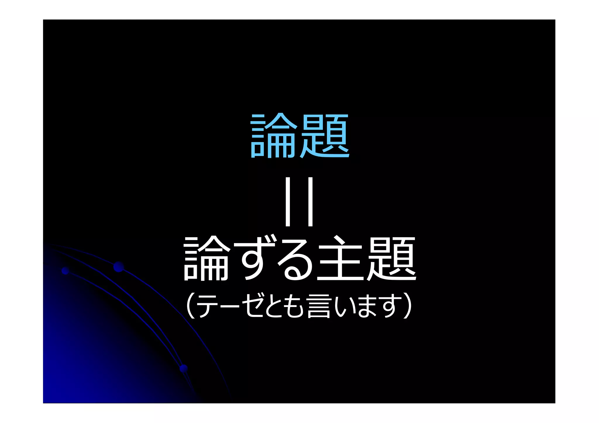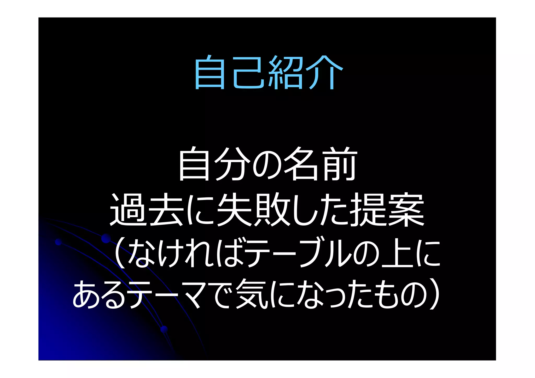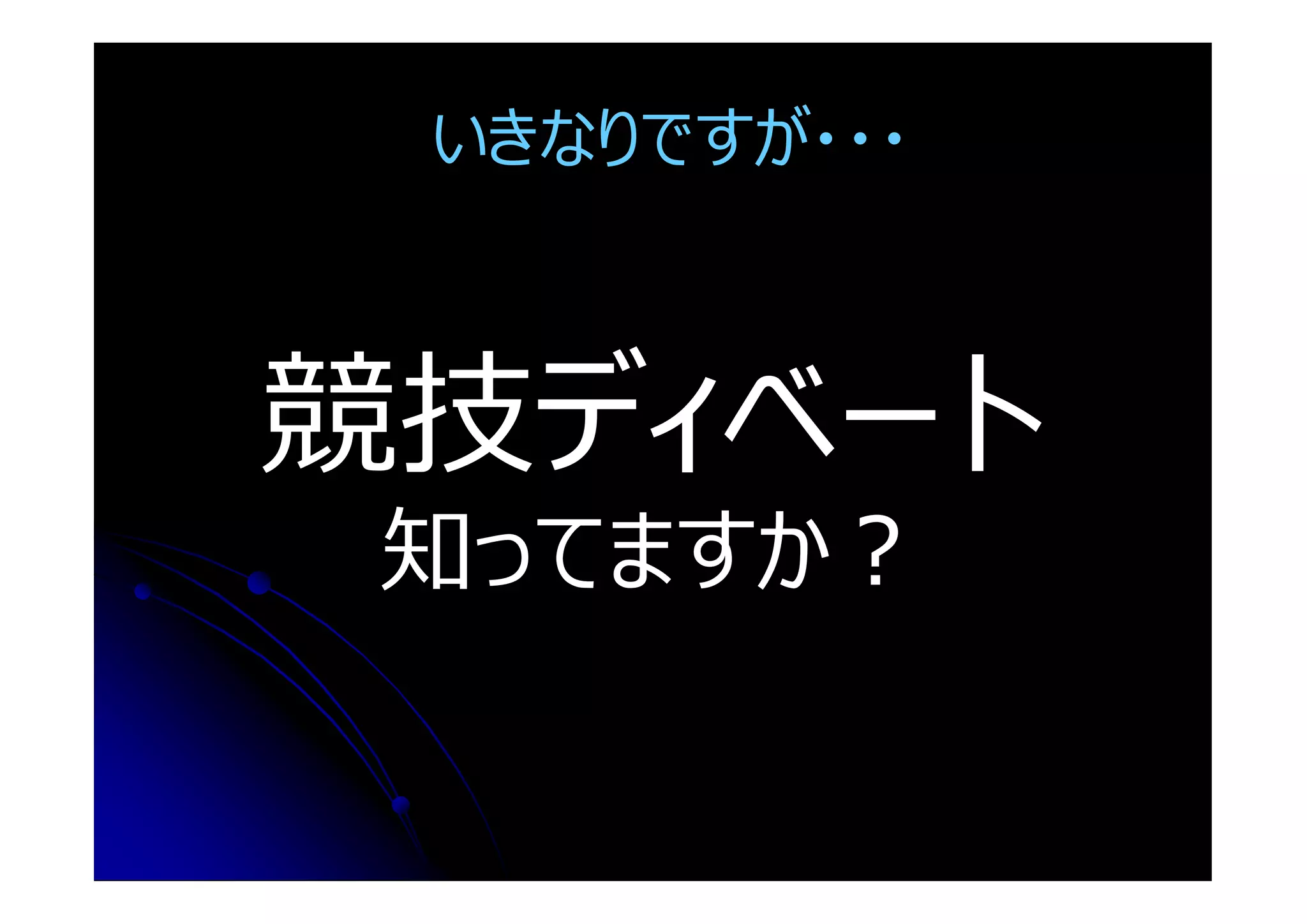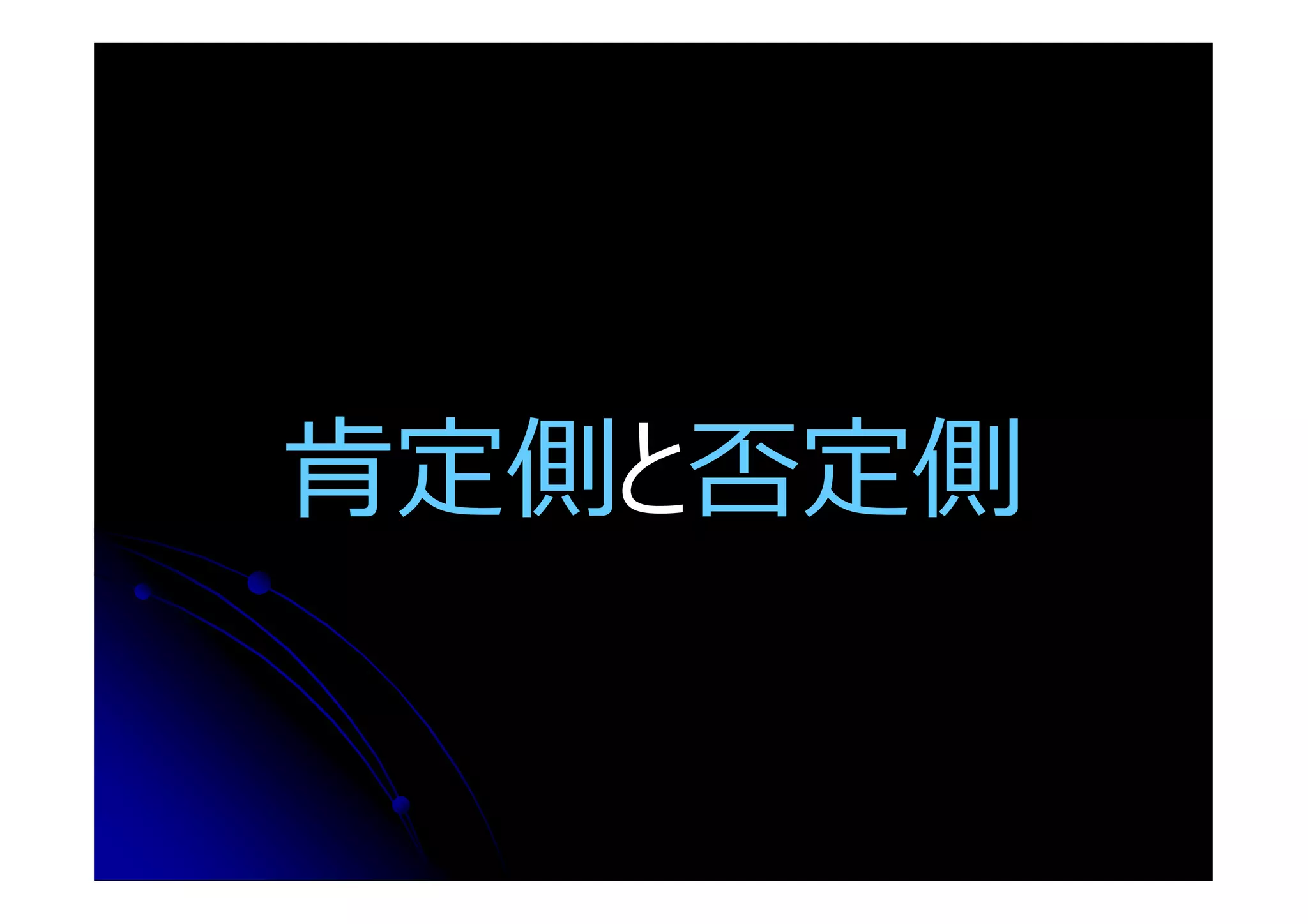 ディベートでは「議論する余地があること 議論する余地があること」をテーマにすることが大事です。 議論する余地があること さらに今回は 証拠資料(エビデンス)を必要としないもの。(スマホで調べる等はOKです) 論題には3つほどあります。 政策論題:やるべきか、やめるべきか?の是非を問う論題です。 例)ソフトウェア会社はペアプログラミングを行うべきである。 価値論題:価値の有無、あるいは優劣を問う論題です。 例)アジャイルは社員を幸せにする。 事実論題:過去、現在、未来に起きた/起きることの有無を問う論題です。 例)メールを廃止しTwitterにすると仕事の効率があがる。 できるだけ議論のしやすさから政策論題を選ぶこと。 テーブルの全員が議論できると思えるものを選びましょう。 政策論題のテーマ例 ・日本政府は,タバコの販売及び消費を禁止すべきである ・日本はペットの売買を禁止すべきである ・市は救急車を有料化すべきである ・エスカレーターでは左に並ぶべきである ・社員同士の年賀状は禁止すべきである ・企業は採用を通年制にするべきである ・企業は時差通勤を導入するべきである ・企業はFacebookページを作成すべきである ・社員旅行は行うべきである ・Excel方眼紙はやめるべきである ・システム開発ではTDDを行うべきである ・人月単価をやめるべきである ・個人評価からチーム評価に変えるべきである ・ソフトウェア会社はペアプログラミングを行うべきである ・ソフトウェア会社はScrumを導入するべきである ・ソフトウェア技術者はもっと給与格差をつけるべきである ・ソフトウェア技術者は勉強会には参加するべきである 価値論題のテーマ例 ・チームのコミュニケーション不足・情報共有不足を 解消するには、ペアプロ、朝会のどちらがふさわしいか? ・アジャイルは社員を幸せにする。 事実論題のテーマ例 ・メールを廃止しTwitterにすると仕事の効率があがる。