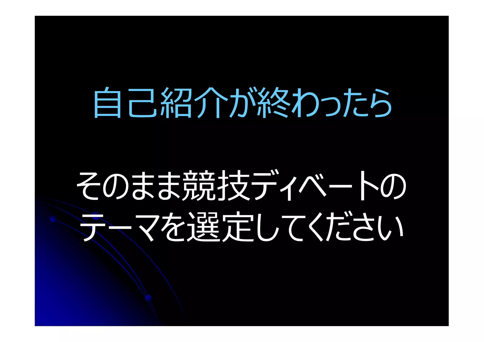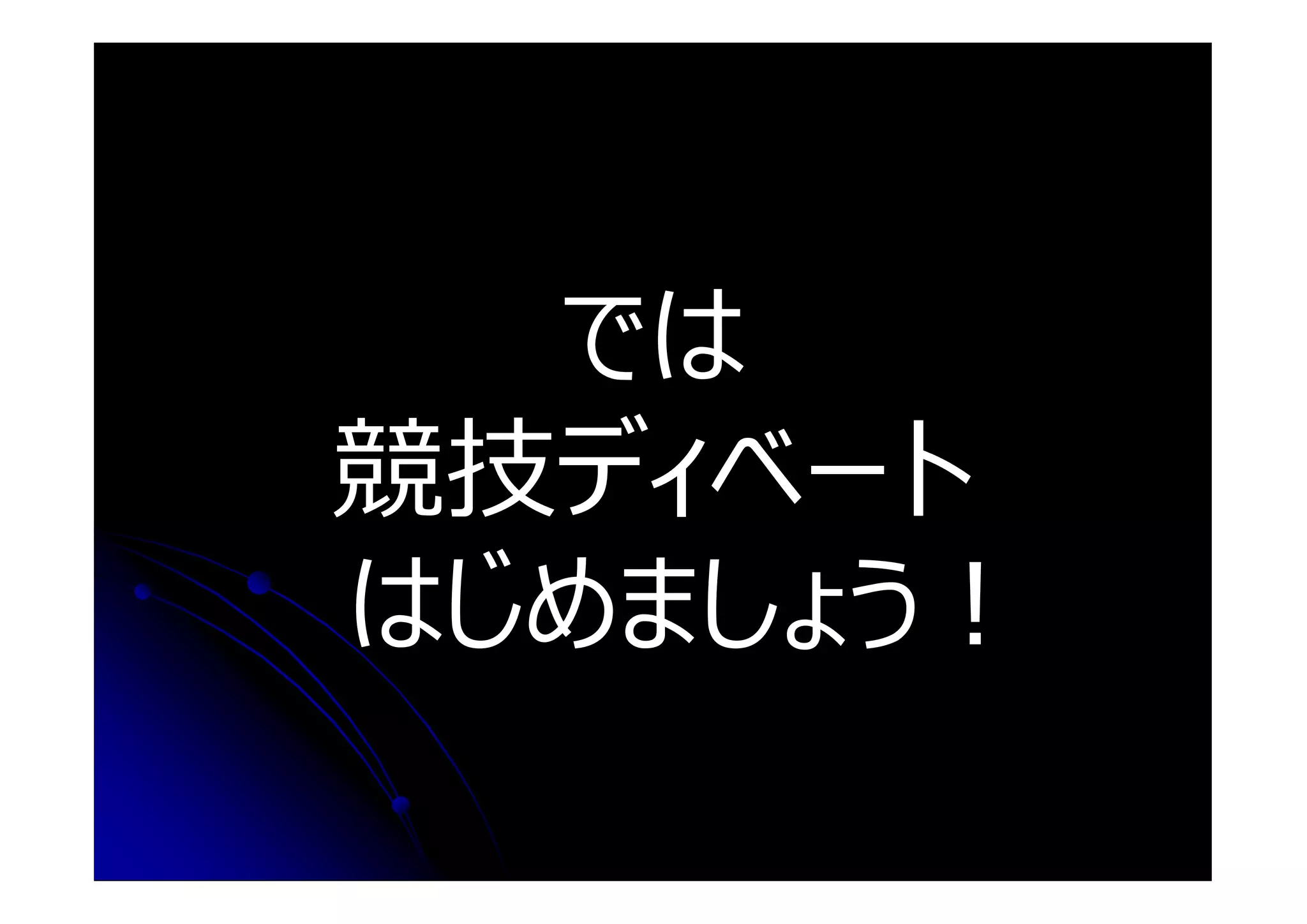 主張 ただいまより肯定側立論を行います。 我々は「 」ということを主張します。 その理由は「 」つあります。 1つは「 」。 もう1つは「 」です。 内容 事実 (第一の理由)「 」については「 」を行うと 「 」ということです。 理由付け なぜ「 」になるかというと 「 」だからです。 証拠資料 ※証拠試料がある場合 ○○の発表によると「 」の場合、 「 」になるとあります。 終わり まとめ これらの理由により「 」にはメリットがあり、 「 」すべきと言えます。 質疑の進め方の例) ※再確認や疑問点を問うフェーズです。 否定側 確認 否定側質疑を行います。 第一の理由については「 」でも効果がありますか? 第二の理由について「 」のケースで説明をお願いします。 肯定側 応答 第一の理由については十分効果があると考えます。 第二の理由について「 」の場合、「 」となり 「 」になると考えます。 第一反駁の進め方の例) ※立論に対する反論を行う 否定側 第一反駁 否定側第一反駁を行います。 第一の理由については「 」でも効果があると言いましたが 「 」に十分に発揮できないはずです。 第二の理由についても立論はもちろん、質疑での内容も 「 」の問題を解決できていません。 第二反駁の進め方の例) 初め 主張 否定側第二反駁を行います。 肯定側反駁に再反駁し「 」ということを主張しま す。 内容 事実 再反駁の理由については「 」を行うと 「 」ということです。 理由付け なぜ「 」になるかというと 「 」だからです。 終わり まとめ これらの理由により肯定側のメリットより 否定側の「 」のデメリットの方が多大にあり、 「 」すべきではないと言えます。