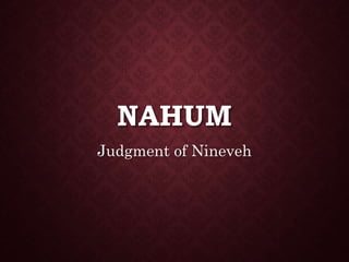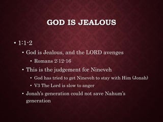 The document summarizes the book of Nahum from the Bible, which contains God's judgment of Nineveh. It discusses how God is jealous and avenging, yet slow to anger. It describes how God is powerful and a stronghold for those who trust in Him. It warns that God will bring an overflowing flood to utterly end those who are His enemies, and asks whether people think they can conspire against God with how they are living. It notes the book contains messages both against Nineveh and words of deliverance for Judah.