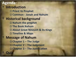 The document provides an agenda for a lesson on the prophets Jonah and Nahum. It begins with an introduction comparing the roles of priests and prophets. It then discusses the prophets Jonah and Nahum, noting they both focused on Assyria and Nineveh and ended their books with a question. The historical background section provides details on Nahum the prophet, the Book of Nahum, the Assyrian kings and Nineveh. The final section breaks down the messages of each chapter of the Book of Nahum and concludes with a quiz.