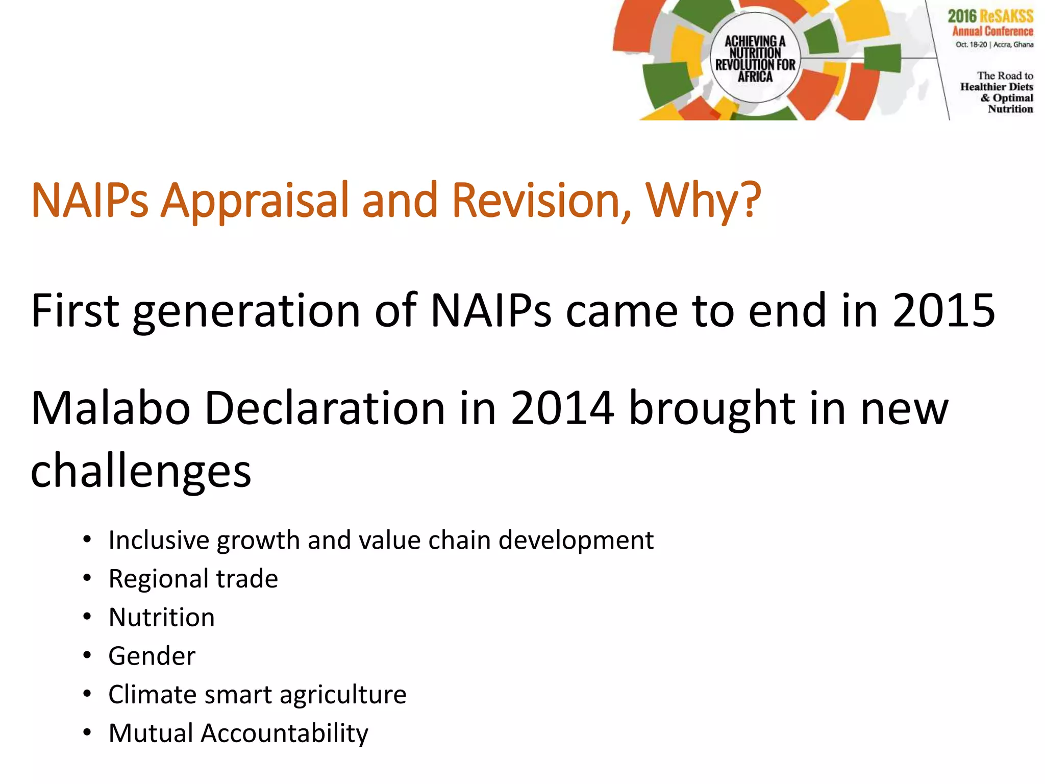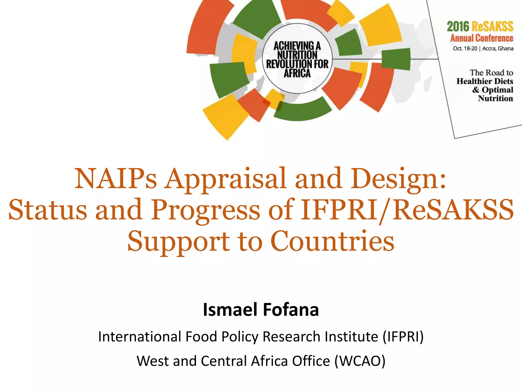 IFPRI/ReSAKSS has provided technical support to countries in appraising and revising their NAIPs following the end of the first generation NAIPs in 2015 and new challenges from the Malabo Declaration. This support included developing a toolkit, expert groups, workshops, identifying metrics and tools, gathering data, and raising analytical questions. The support also aided stepwise strategic analysis including setting goals and targets aligned across frameworks, assessing baseline status and capacities, and developing alternative prospects for agricultural growth and poverty reduction. Overall, the technical support aimed to help with appraising NAIPs at the continent, regional, and country levels.
