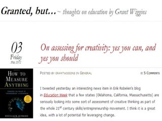 This document discusses bringing innovation to schools. It begins with questions about how to bring innovation to different areas like student learning, schedules, assessments, spaces, creativity, and leadership. The challenges of innovation in schools are presented, along with action steps like finding allies and removing roadblocks. Specific innovations are then outlined, such as adopting a 21st century mindset, design thinking, transdisciplinary education, and performance tasks. Contact information is provided for three people involved in innovation efforts at Mount Vernon schools.