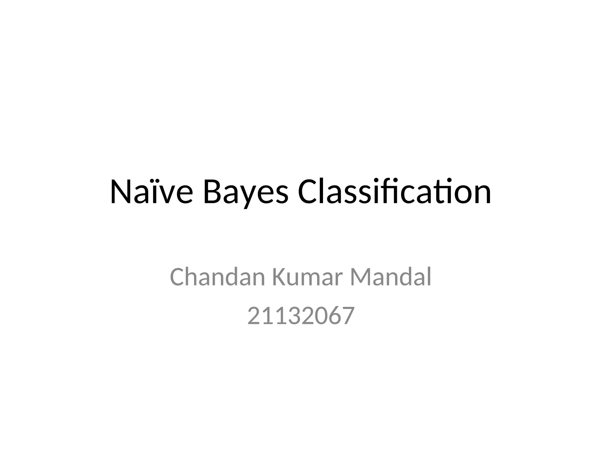 The document discusses Naïve Bayes classification, explaining its applications in spam classification, medical diagnosis, and weather prediction. It covers the Naïve Bayes assumptions, how to train the classifier using training data, handling numerical attributes, outputting probabilities, and evaluating classification algorithms. Additionally, it highlights performance evaluation techniques, including confusion matrices, ROC analysis, and cross-validation methods.