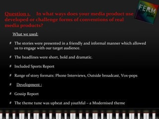 The document summarizes the group's youth-oriented radio newscast project. It discusses how they engaged their target audience of 13-20 year olds using an informal tone and styles popular with youth. It also represented various social groups like students and ethnic minorities. Research showed most listeners were aged 16-20 and preferred listening on their phones in the evening. The newscast attracted its target audience through relevant news, a variety format, and young presenters. The group learned about using various audio software and technology throughout the project.