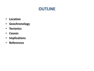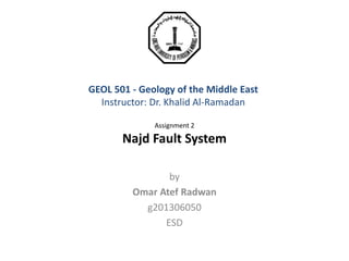 The Najd Fault System extends over 1200 km through the northeastern Arabian Shield. It was active between 630-530 Ma as a dextral and later sinistral strike-slip fault system that reactivated in the Tertiary. It caused block movements in the basement and affected Phanerozoic cover strata for over 100 km. The fault system was associated with hydrothermal vein mineralization including gold, copper, zinc and silver. It also influenced the formation of the giant Ghawar oil field in central Saudi Arabia.