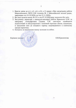 4o n.l, n.2, n.8, n.10, n.l2 uaxazy <flpo opranisaqiro po6orz Mraxonai'scrroro 33CO I-III crynenin Ns 3 Muroraincrxoi rrlicrxoi pa4u>, 3aMiHr.rBurrl <<no 24.10.2020> na <no | 5.1 1.2020>>. 2. Bci isrui nyHKrr.r HaKa3y l! 331-x sitQT .10.2020 pory sa.nururrll 6es sNaiH. 3. 3acryunzxy ArrpeKTopa 3 HaBqaJrbHo-sl4xeeHoi po6orr.r Kpaeueuro O.M. ra 3aBiAyBaqy roc[oAapcrBoM firaAuur T.M. cBoesacHo ogsaiolruru ne4aroriuHr.rft Ta o6cryroByro-rufi i rexHiqHIafi nepcouar uir<onu, eiAnoniAHo, ig sHeceuHqv srr,riu go riHrlesoro repuiny 3alpoBa.Il)KeHoro e ocsirurorray 3aKna.qi KapaHTrrHy. O.B.Koacnoneeea