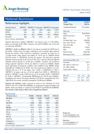 National Aluminium's (Nalco) net revenue in 1QFY2011 increased 40.2% year-over-year to Rs. 1,292 crore, driven by higher realizations and sales volumes. Net profit increased 124.8% to Rs. 284 crore. EBITDA margin expanded significantly to 30.5% due to declines in raw material, power, and staff costs. While aluminum and chemical segments saw revenue growth, the energy segment's revenue declined 25.1% despite higher power generation. The company continues to face challenges around coal supply and has limited growth visibility beyond current expansion plans.