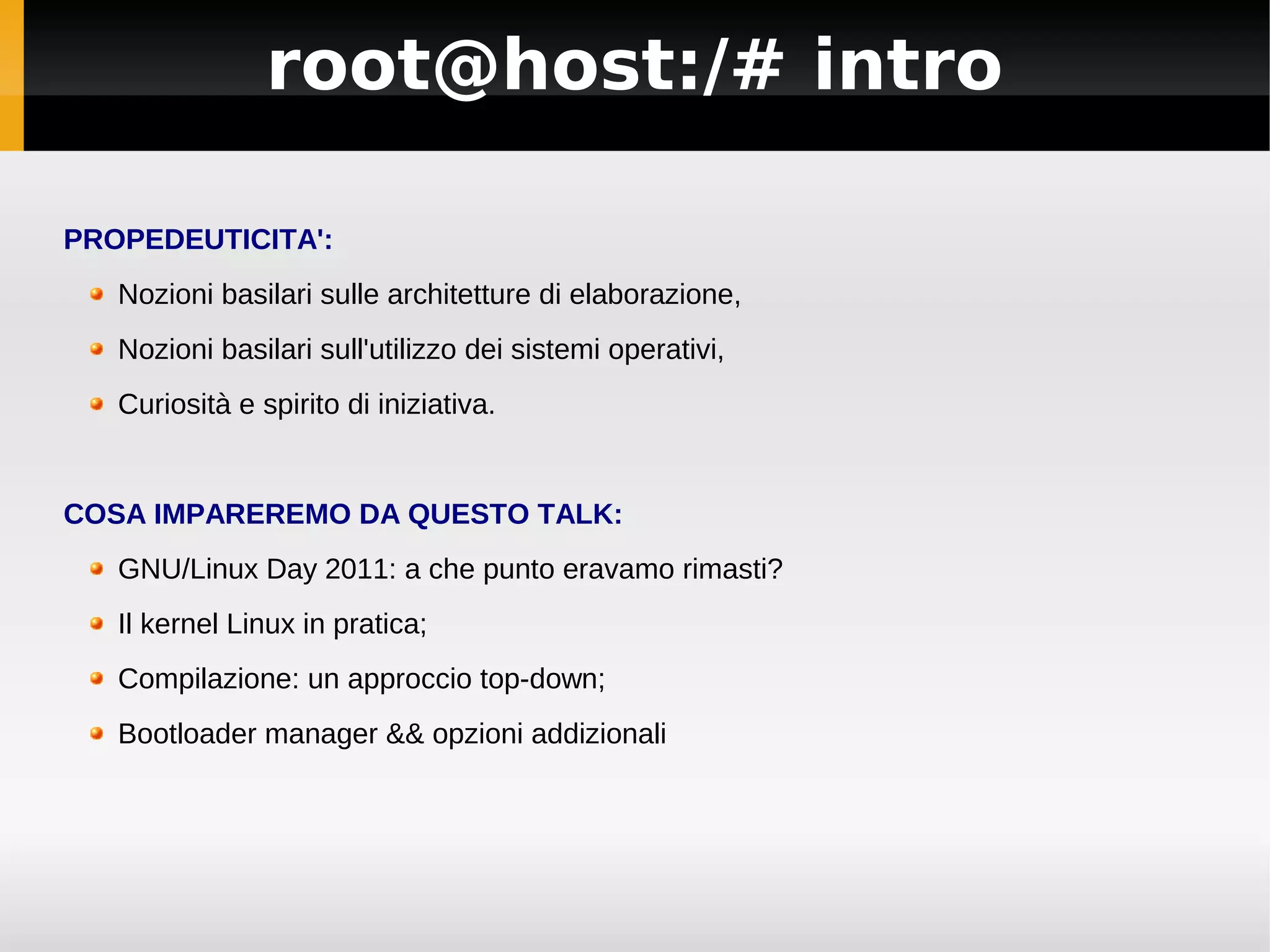 Questo documento è una guida dettagliata sulla compilazione del kernel Linux, presentata durante un workshop dell'Università degli Studi di Napoli Federico II. Viene fornita una panoramica delle nozioni fondamentali necessarie, dei passi per la configurazione e compilazione del kernel, oltre a indicazioni su come gestire moduli e driver. Infine, si introducono le opzioni di avvio e i consigli pratici per evitare errori comuni durante il processo.