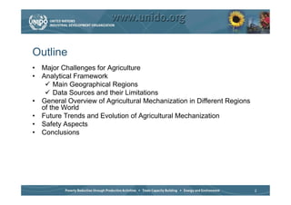 The document discusses world trends in agricultural machinery manufacturing. It outlines the major challenges facing agriculture globally and analyzes the sector by geographical regions. For each region, it provides an overview of the current status of mechanization and predicts future trends over the next 10 to 20 years, such as increasing levels of mechanization and annual growth rates for various machinery exports, imports, and domestic demand. Key drivers of increasing mechanization include technical progress, economic growth, and biofuel production, while economic crises may slow growth.