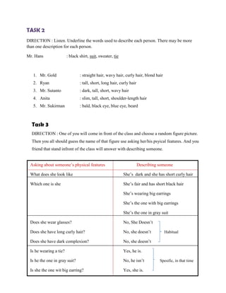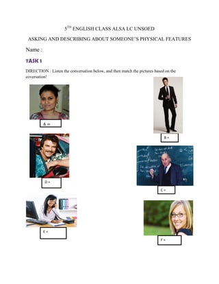 The document provides instructions for an English class activity where students practice describing physical features to identify people. The activity involves listening to a conversation to match pictures, underlining descriptions of people, and taking turns having one student select a picture for others to guess by asking questions about physical traits like hair, clothing and accessories. Descriptions include short curly hair, fair skin, black hair, earrings, gray suit, and wearing a tie.