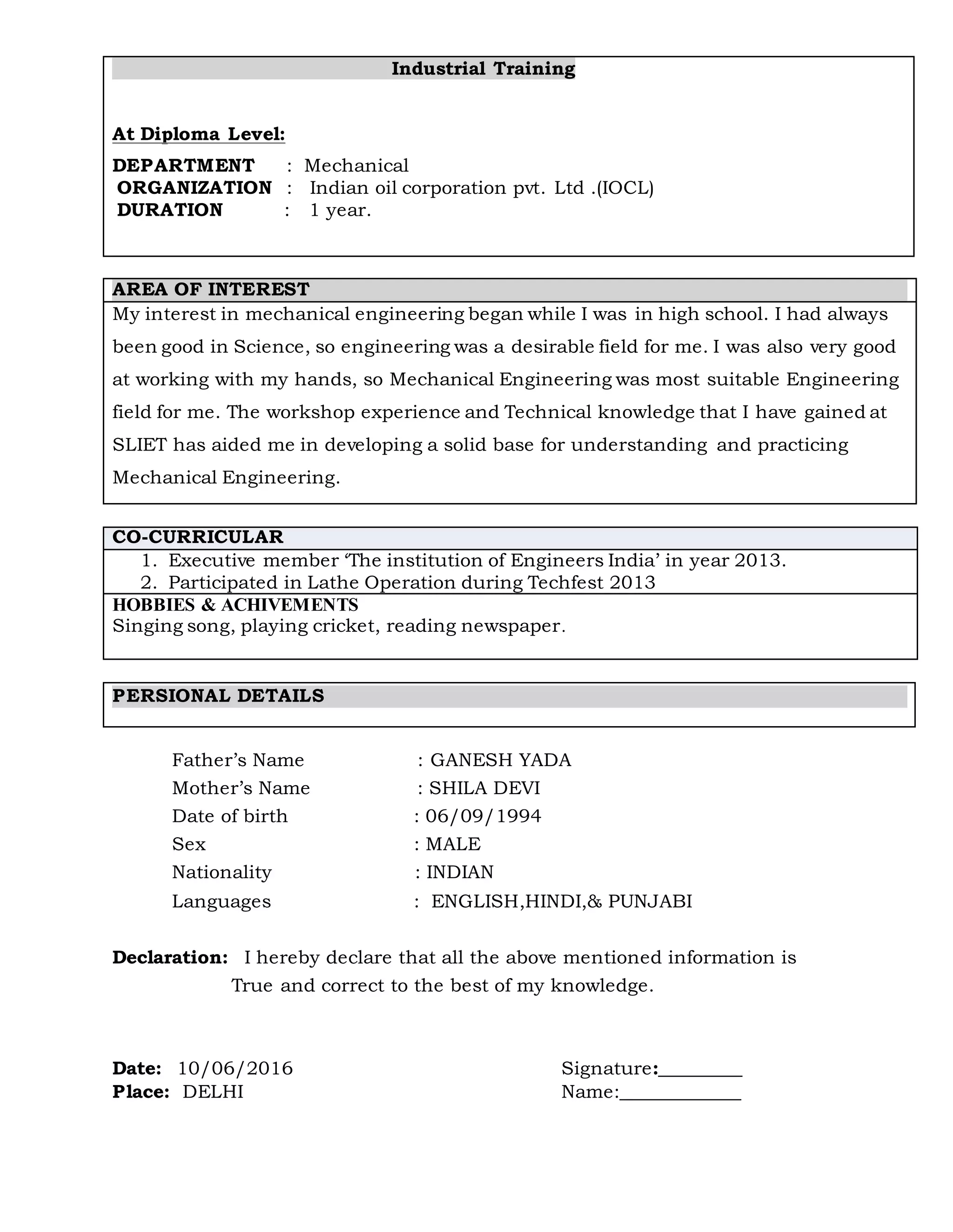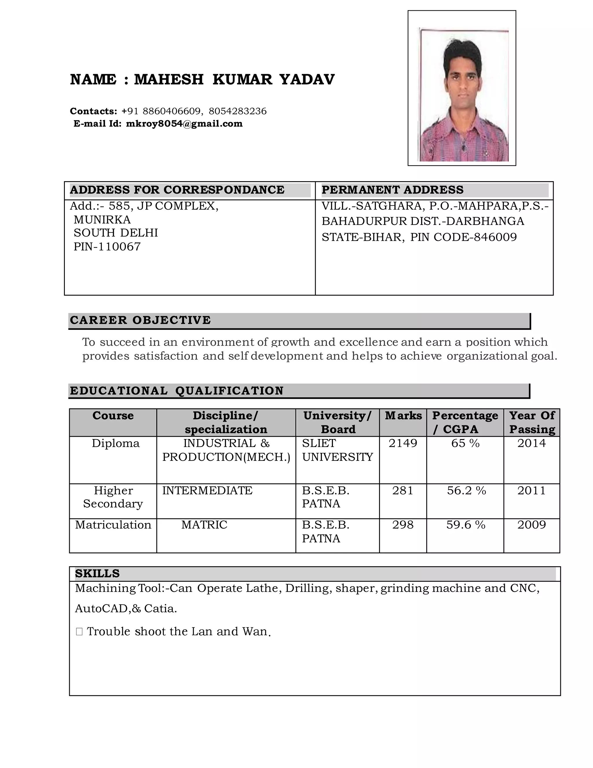 Mahesh Kumar Yadav is seeking a career opportunity in mechanical engineering. He has a Diploma in Industrial and Production Engineering from SLIET University with 65% marks. He has skills in operating lathes, drilling machines, shapers, grinders, and CNC machines. He enjoys singing, playing cricket, and reading newspapers.