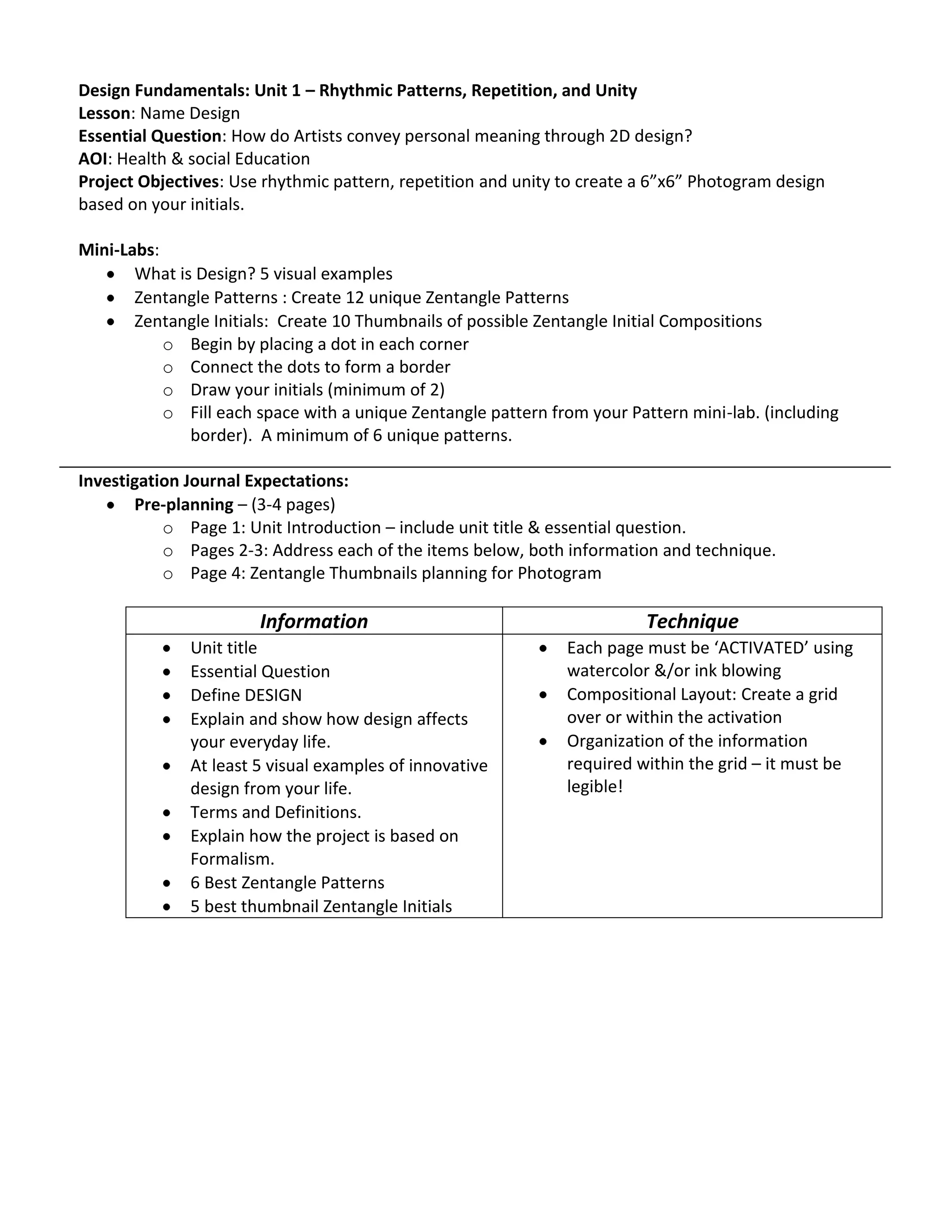 This document provides instructions for a design project asking students to create a photogram using their initials made of zentangle patterns. The project objectives are to use rhythmic patterns, repetition, and unity to create a 6"x6" photogram design based on their initials. Students are instructed to create zentangle patterns for their initials, take photograms of the design on photographic paper, and mount the photograms radially to showcase their initials made of zentangle patterns. The document outlines expectations for pre-planning and post-planning journal entries to reflect on techniques learned and how the project relates to the unit's essential question and area of inquiry.