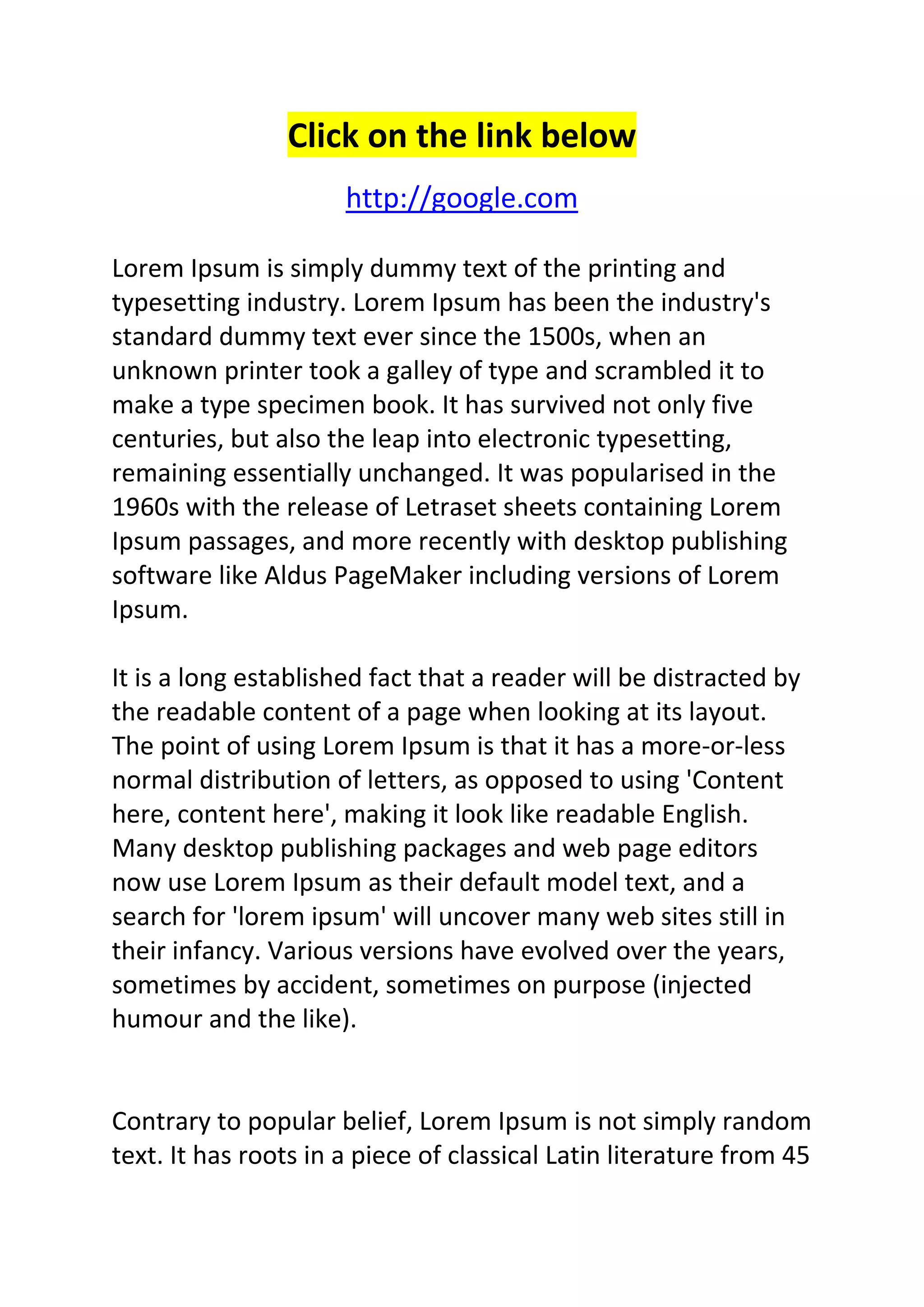 The document discusses the history and purpose of Lorem Ipsum, which has been used as placeholder text by printers and publishers to demonstrate text layout since the 1500s. It originated as a scrambled Latin text in 45 BC, and has survived centuries of use in print and digital publishing without changing. Sections of Cicero's classical work are the source of the repeated "Lorem ipsum" text used as a standard placeholder by publishers.