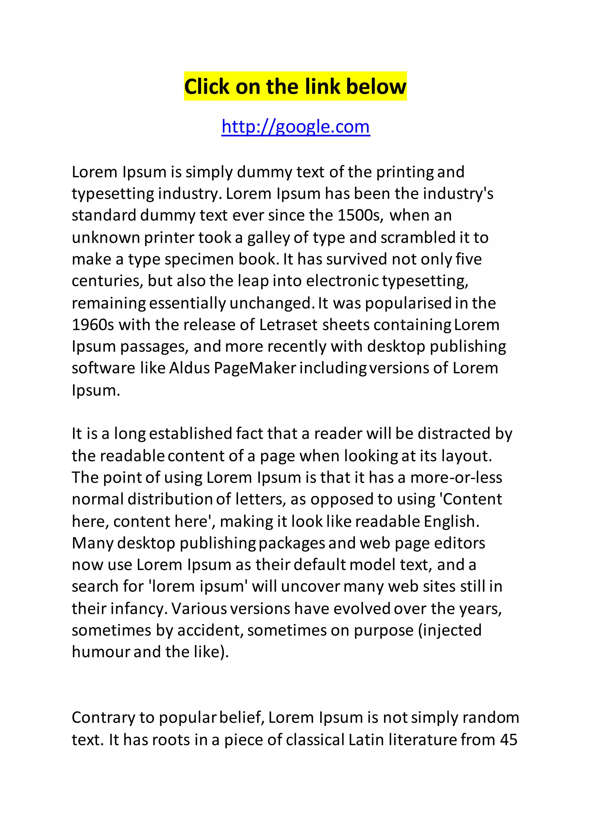 Click on thelink below http://google.com Lorem Ipsum is simply dummy text of the printing and typesetting industry. Lorem Ipsum has been the industry's standard dummy text ever since the 1500s, when an unknown printer took a galley of type and scrambled it to make a type specimen book. It has survived not only five centuries, but also the leap into electronic typesetting, remaining essentially unchanged. It was popularised in the 1960s with the release of Letraset sheets containing Lorem Ipsum passages, and more recently with desktop publishing software like Aldus PageMaker including versions of Lorem Ipsum. It is a long established fact that a reader will be distracted by the readable content of a page when looking at its layout. The point of using Lorem Ipsum is that it has a more-or-less normal distribution of letters, as opposed to using 'Content here, content here', making it look like readable English. Many desktop publishing packages and web page editors now use Lorem Ipsum as their default model text, and a search for 'lorem ipsum' will uncover many web sites still in their infancy. Various versions have evolved over the years, sometimes by accident, sometimes on purpose (injected humour and the like). Contrary to popular belief, Lorem Ipsum is not simply random text. It has roots in a piece of classical Latin literature from 45