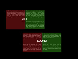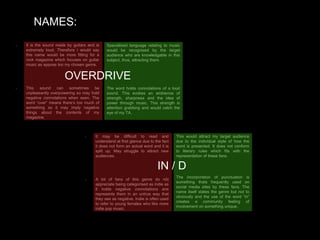 The document discusses potential names for a magazine focused on alternative music genres, including "Overdrive", "IN/D", "Sound", and "ALT". It provides reasoning for and against each name in terms of how well it would attract the target audience, represent the genre, and be easily understood at a glance. While some names like "Overdrive" and "IN/D" may attract only certain fans or be difficult to read, "Sound" creates positive connotations and is short to catch attention, and "ALT" introduces the genre without stigma while using specialized language recognized by fans.