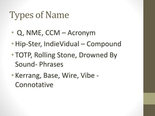 This document discusses different types of names used for music publications, including acronyms, compound words, and phrases. It also analyzes the name "Kerrang" specifically, noting that the word is meant to evoke the sound of a guitar or bang, implying loud and crashing rock music. The distressed black and white lettering of the name graphically represents screeching or explosive songs.