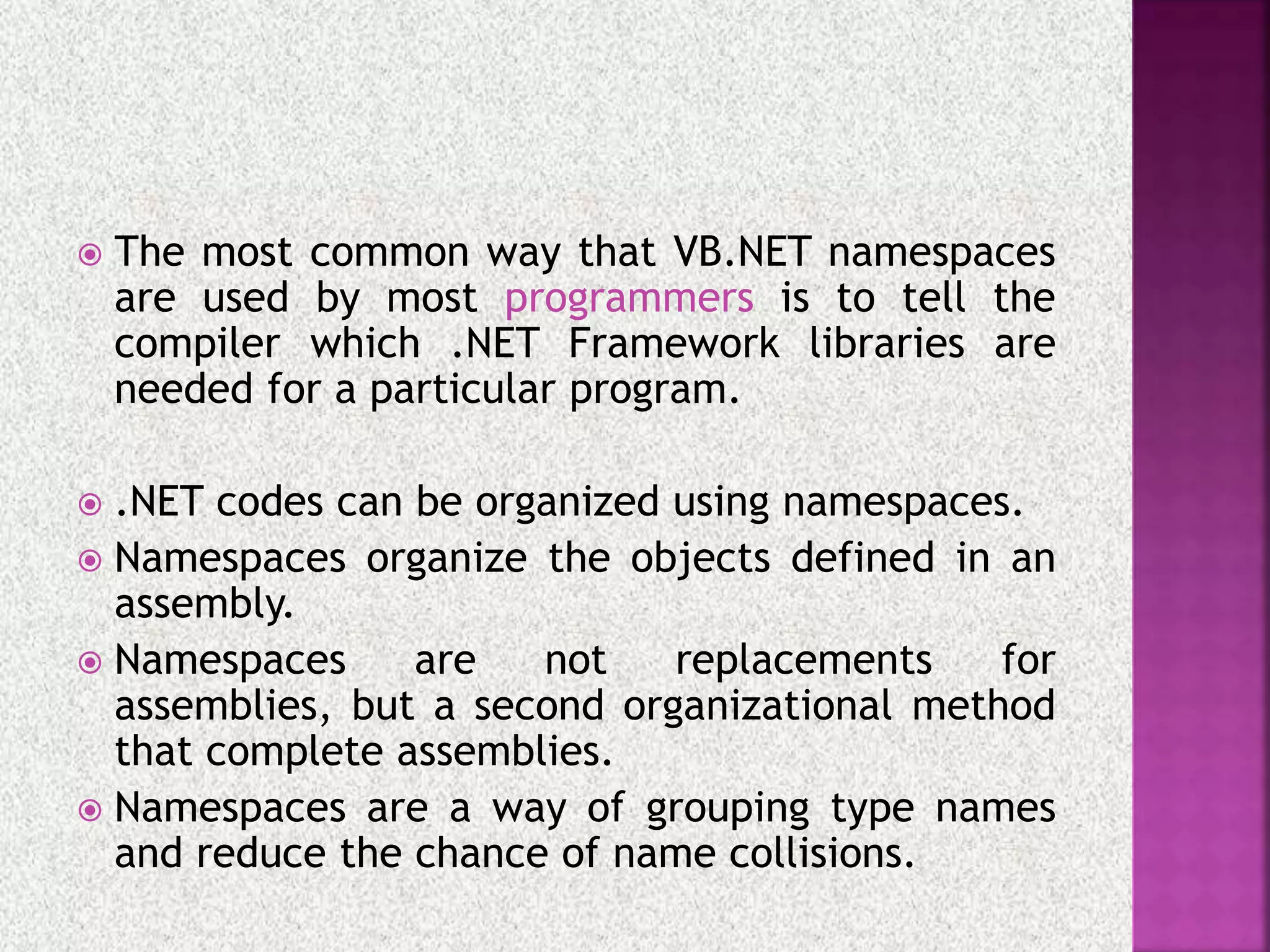 VB.NET namespaces organize code by grouping related type names and reducing name collisions. Namespaces are commonly used to specify which .NET framework libraries are needed for a program. Code can be organized into hierarchies with namespaces nested within other namespaces. For example, the Button class is contained within the System.Windows.Forms namespace, which is part of the larger System namespace that contains many commonly used namespaces like System.IO and System.Collections.