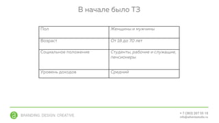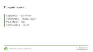 Документ описывает деятельность a.studio, которая за пять лет успешного сотрудничества с клиентами реализовала различные проекты. Также рассматриваются ключевые характеристики для создания брендов, такие как благозвучность, уникальность и возможность регистрации. В числе примеров названий упоминаются как оригинальные, так и известные бренды.