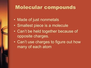 Molecular compounds are made of nonmetals and cannot be held together by opposite charges like ionic compounds. To name molecular compounds, prefixes are used to indicate the number of atoms and the names of the elements are written with "-ide" at the end. Some common prefixes are mono-, di-, tri-, tetra-, etc. and to write the full name, the prefix, element name, prefix, element name, and "-ide" are written.