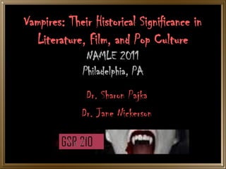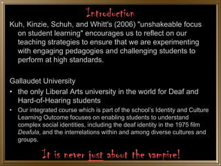 This document discusses a course on vampires taught at Gallaudet University. The course examines vampires in literature, film, and pop culture from various historical and critical perspectives. Students engage with texts like Dracula and Nosferatu, analyze films like Deafula, and discuss representations of vampires in popular culture. Students also write scripts and create short films on vampire themes. The goal is for students to develop visual literacy and critical thinking skills through interactive study of vampires across media.