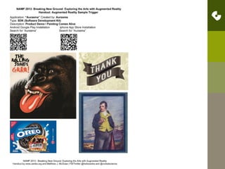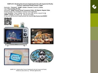 Mobile augmented reality (AR) allows digital information to be overlaid onto the real world when viewed through a mobile device camera. The document discusses AR applications in cultural heritage, design, astronomy, commerce and more. It provides examples of AR being used in the arts, such as interactive murals and installations that bring street art to life. The document also brainstorms ideas for using AR in arts marketing, such as allowing audiences to try virtual costumes or showing actors in costume via overlays.