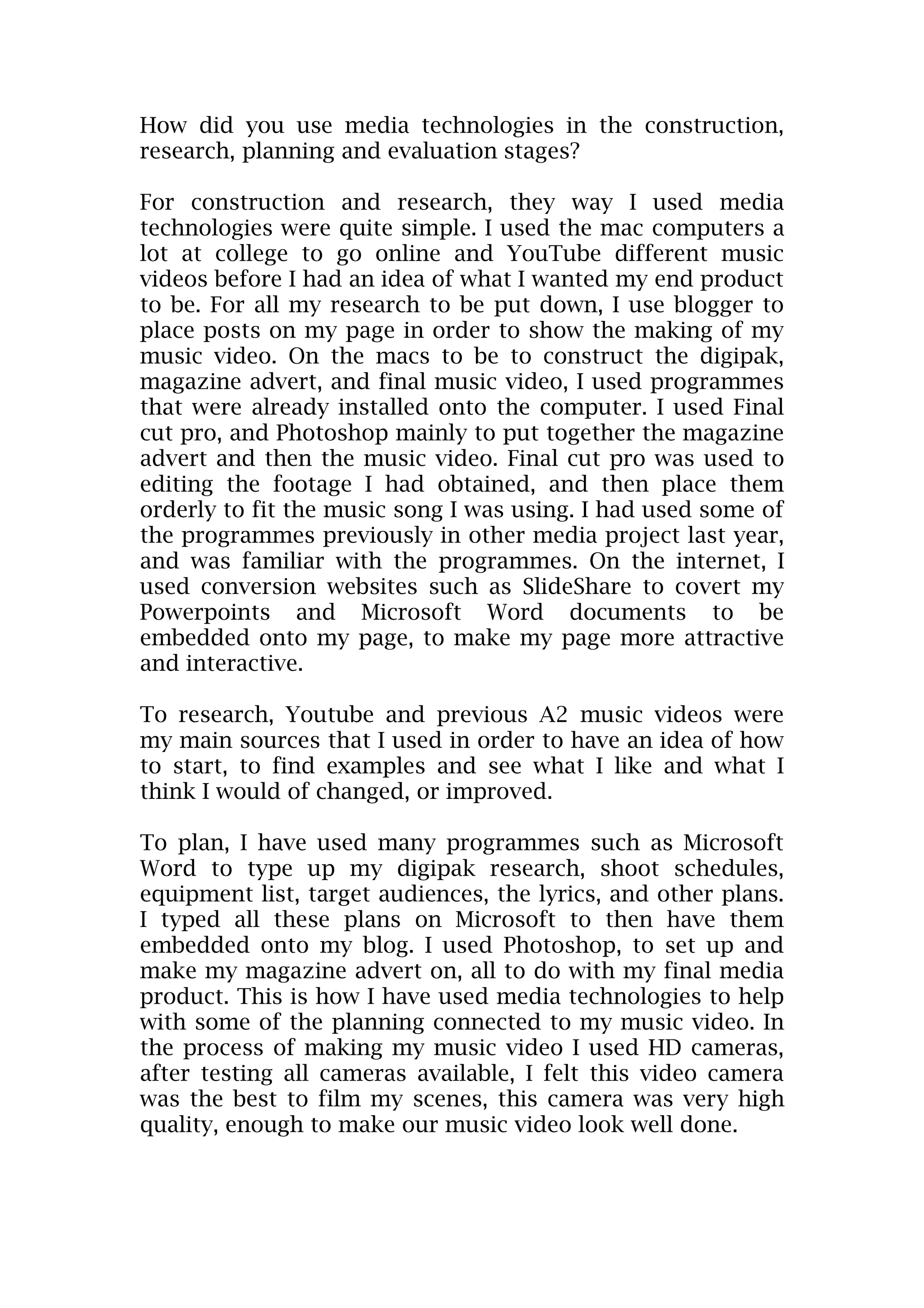 For construction and research, the student used mac computers to search YouTube for music videos to inspire their own end product. They used Blogger to document their research and music video production process. For constructing deliverables like a digipak, magazine ad, and music video, they used Final Cut Pro and Photoshop on the mac. For planning, they created documents in Microsoft Word for schedules, audiences, lyrics, and more. They embedded these plans onto their blog. Photoshop was used to design a magazine ad. HD cameras were tested and used to film scenes for the music video. For evaluation, audience feedback was collected through written notes, photos, and presentations were made to answer questions.