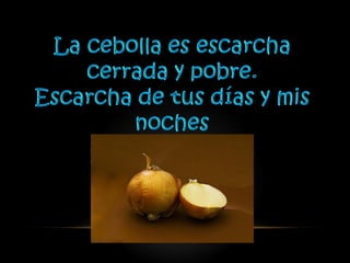 Miguel Hernández was a Spanish poet who wrote during the early 20th century. One of his most famous poems is "Nanas de la Cebolla" or "Lullabies of the Onion", which describes a mother singing to her children while peeling onions. The poem uses the imagery of cutting onions to represent the tears and hardships of life. It is considered one of Hernández's most memorable works for its simplicity and ability to convey profound emotion.