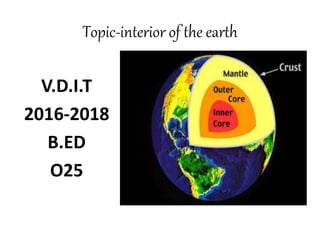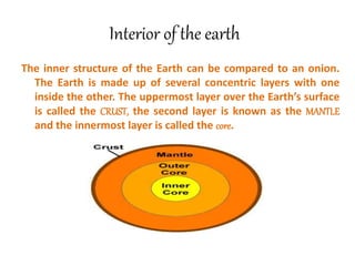 The document discusses the interior structure of the Earth. It is composed of three main layers - the crust, mantle, and core. The crust is the outermost layer and thinnest, made up of silicates. Below is the thick mantle layer, divided into upper and lower sections. The innermost layer is the core, made of iron and nickel. Rocks form the crust and are made of minerals - the basic building blocks. There are three main types of rocks: igneous formed from cooled magma, sedimentary formed from compressed sediments, and metamorphic formed from changes to pre-existing rocks under heat and pressure.