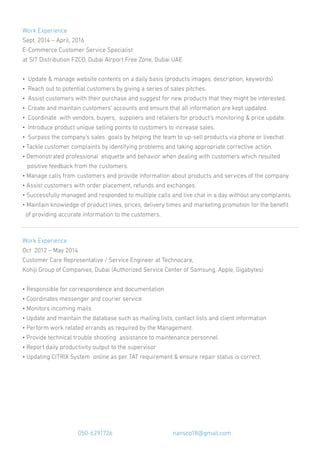 Nancy Dela Cruz is a technical support specialist with over 15 years of experience in customer service and technical roles. She has excellent communication skills in English and experience managing e-commerce systems. Her career objective is to find a position in electronics or telecommunications where she can utilize her expertise. She has held roles providing technical assistance, customer service, and e-commerce management for companies in Dubai.