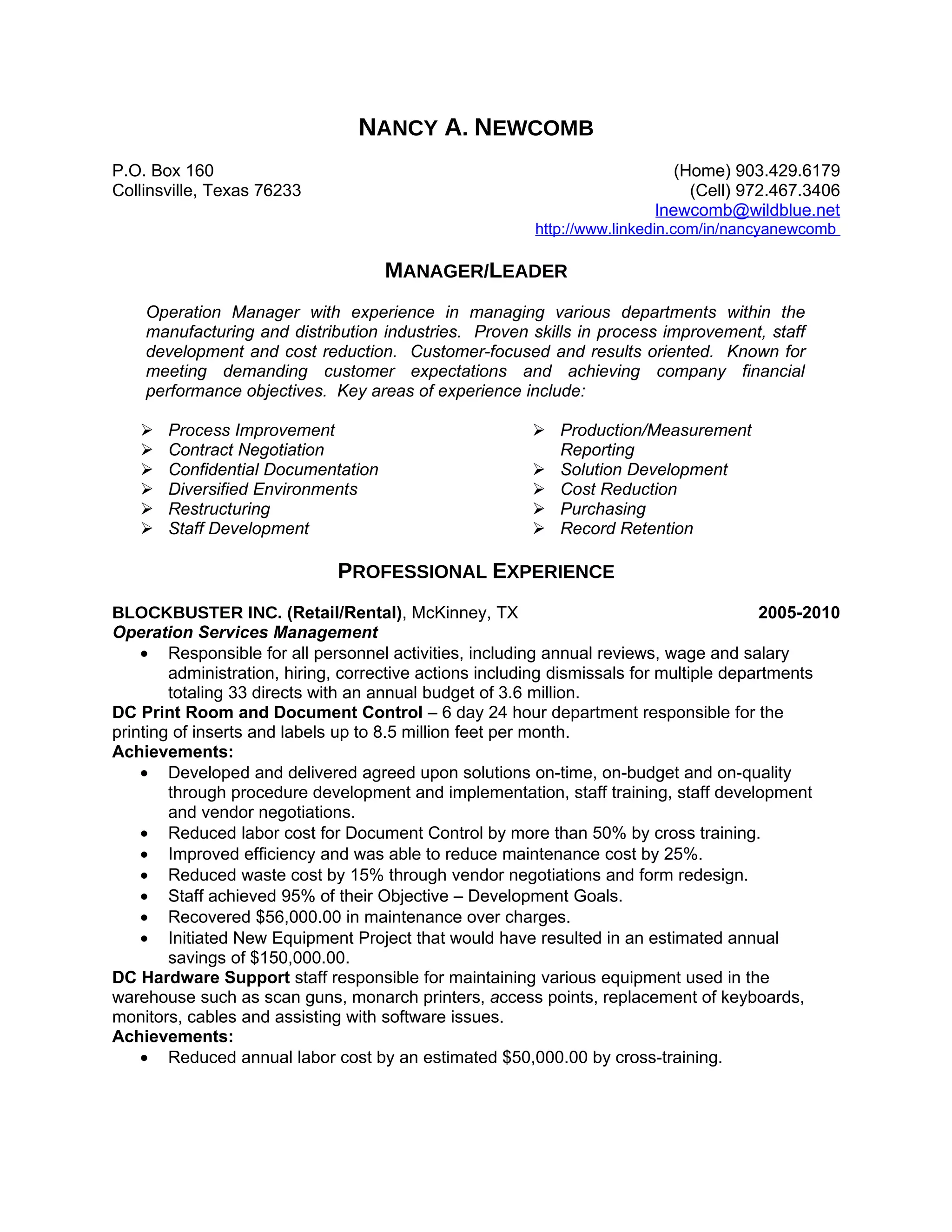 Nancy Newcomb is an experienced operations manager seeking a manager/leader position. She has 20 years of experience managing various departments in manufacturing and distribution. She is skilled in process improvement, staff development, cost reduction, and meeting customer expectations. Her experience includes process improvement, contract negotiation, production reporting, cost reduction, purchasing, and staff development. She has a proven track record of achieving financial and operational goals at prior employers.
