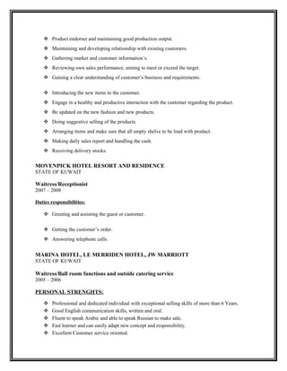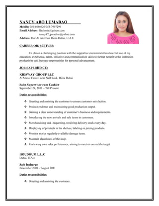 This document contains the resume of Nancy Abo Lumabao, a Filipino national seeking employment in Dubai, UAE. She has over 6 years of experience in sales and customer service roles in Dubai and Kuwait. Her most recent role was as a Sales Supervisor and Cashier at Kidsway Group LLC in Dubai since 2011. She is seeking a challenging position that utilizes her education and skills in communication, customer service, and sales.