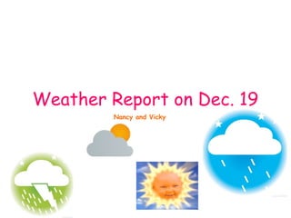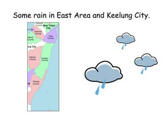 The weather report for December 19th predicts some rain in the East Area and Keelung City of Taiwan. The North Area will be cool and partly rainy with temperatures between 11-15°C. The Central Area will be cloudy with temperatures of 11-14°C while the South Area will be dry and brisk with temperatures from 14-16°C. The East Area will be wet with temperatures of 13-17°C. Viewers are advised to bring umbrellas and keep warm.