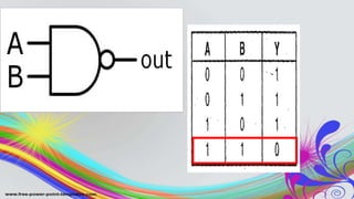 The document discusses a NAND latch, which is a type of sequential logic circuit that can store one bit of information. It consists of two cross-coupled NAND gates that provide feedback to each other. The state of the latch's output Q is determined by the previous inputs and state, not just the current inputs. The NAND latch can be set to 1 by applying a 1 to the S input and reset to 0 by a 1 on the R input. It will maintain its output state as long as neither input is active.