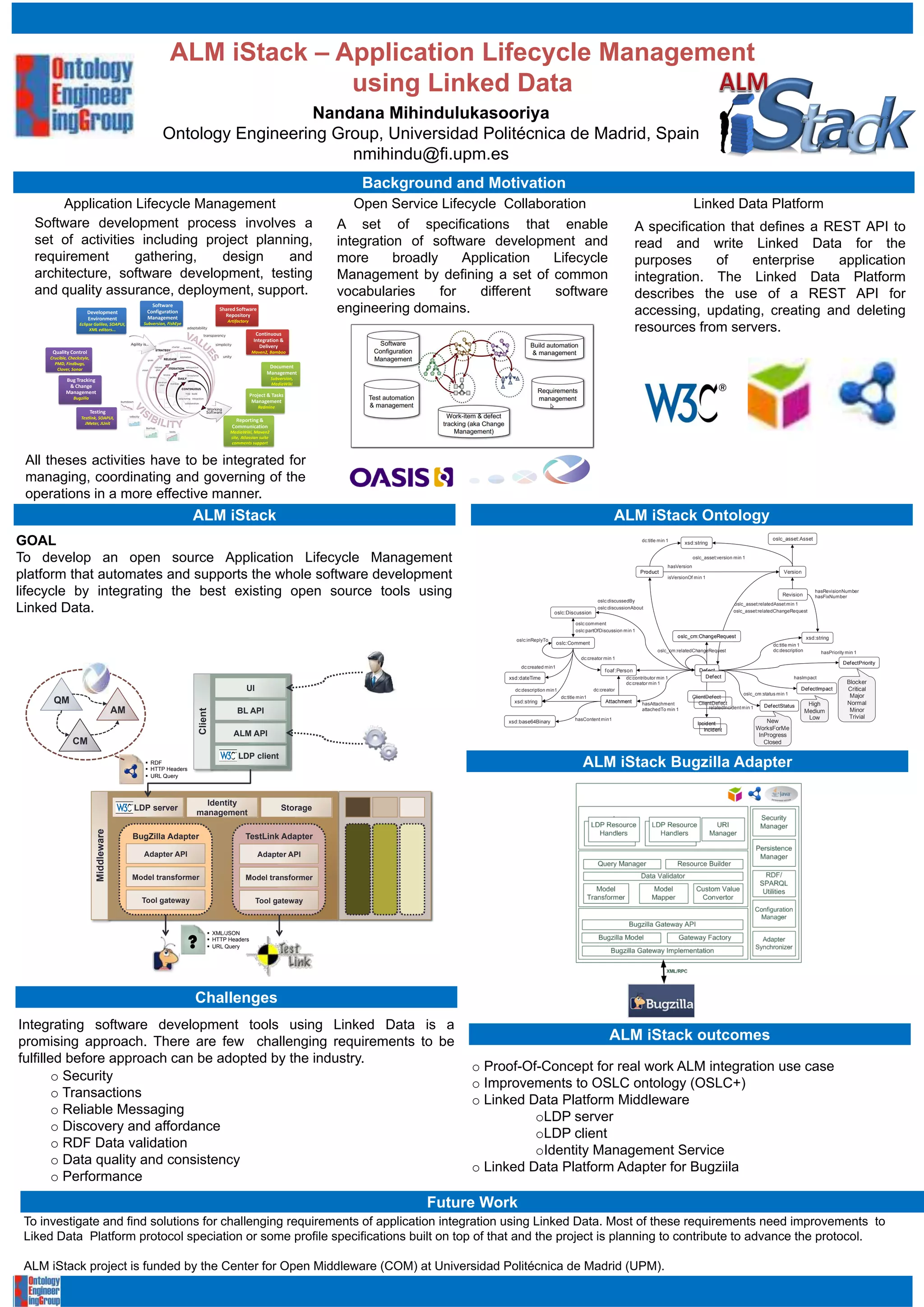 The document discusses the alm istack project aimed at enhancing application lifecycle management (ALM) using linked data, focusing on integration with existing open-source tools and addressing specific challenges in data integration. It outlines the goals of developing a linked data platform, creating a REST API for enterprise application integration, and improving OSLC ontology. Additionally, the document highlights the project's funding source and future work to address integration requirements in the software development lifecycle.