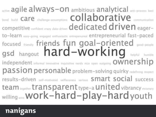 The document discusses the importance of workplace culture for business success, highlighting that genuine culture should be organic and reflect shared experiences among employees. It describes the company's rapid growth and how their culture is defined by traits like hard work, collaboration, transparency, and a fun environment, with employees sharing a strong bond and commitment to their goals. This 'culture deck' serves as a guide for hiring and reflects the company's success, demonstrating that their culture has developed authentically rather than being imposed.