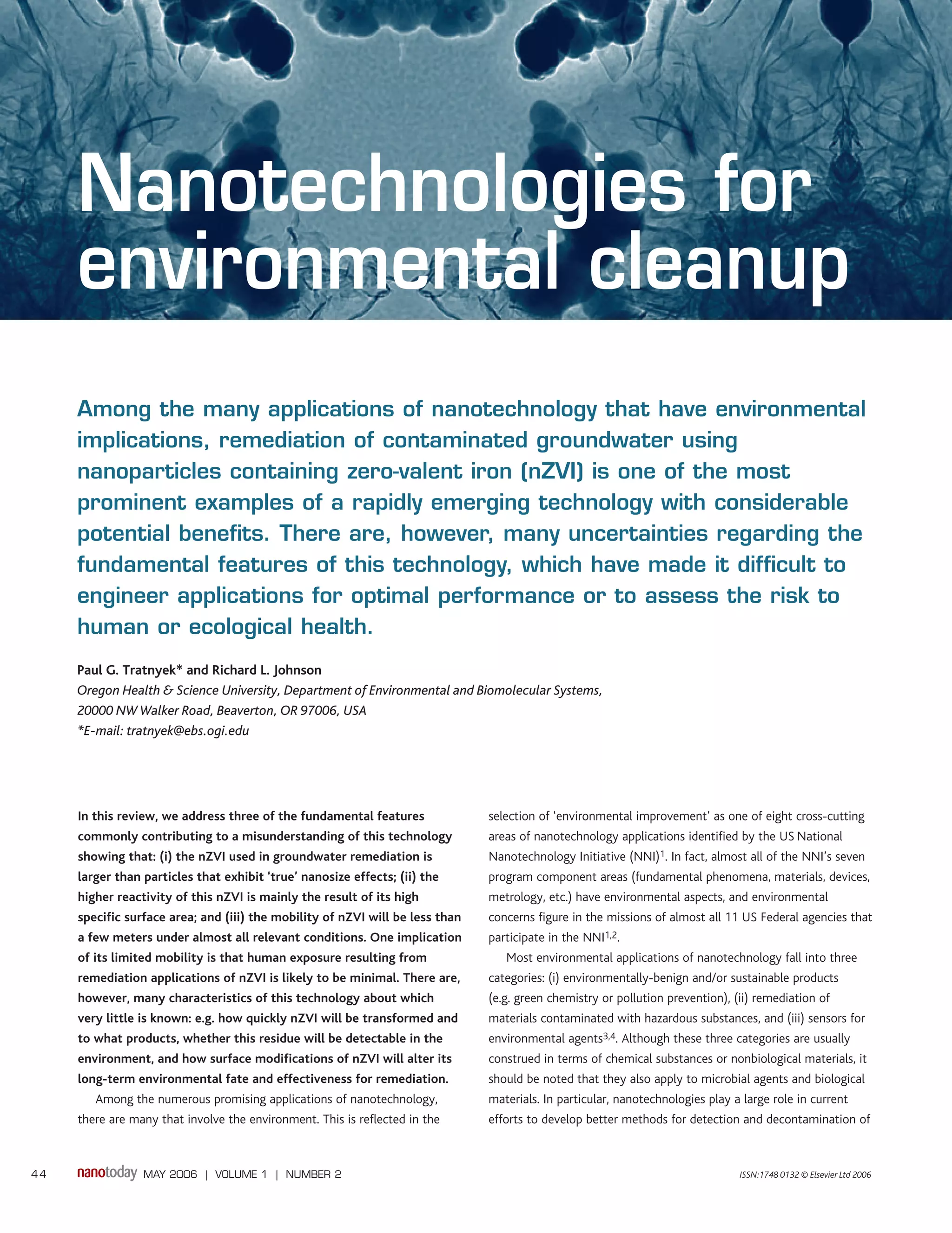 Nanotechnologies show potential for environmental cleanup through remediation of contaminated groundwater and soil. Specifically, injecting nanoparticles containing zero-valent iron (nZVI) underground can degrade pollutants in situ. However, the nZVI used is larger than true nanoparticles and behaves more like environmental colloids than nanoparticles. Its reactivity comes from high surface area rather than nanoscale effects, and it has limited mobility underground of only a few meters. More research is still needed to understand how nZVI transforms over time and impacts the environment.